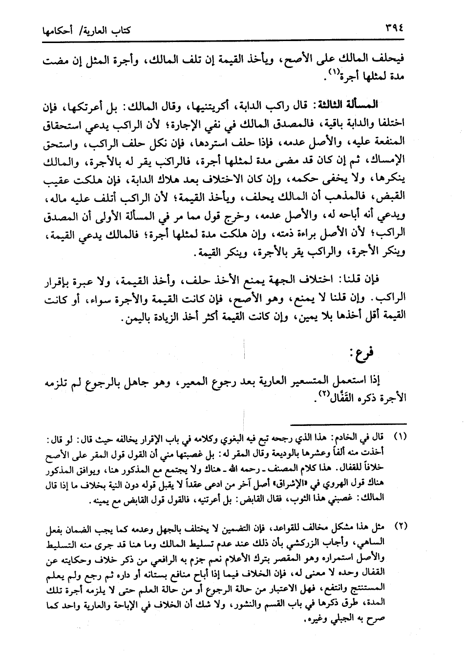 المسألة الثالثة: قال راكب الدابة، أكريتنيها، وقال المالك: بل أعرتكها، فإن اختلفا والدابة باقية، فالمصدق المالك في نفي الإجارة؛ لأن الراكب يدعي استحقاق المنفعة عليه، والأصل عدمه، فهذا حلف استردها، فإن نكل حلف الراكب، واستحق الإمساك، ثم إن كان قد مضى مدة لمثلها أجرة، فالراكب يقر له بالأجرة، والمالك ينكرها, ولا يخفى حكمه، وإن كان الاختلاف بعد هلاك الدابة، فإن هلكت عقيب القبض، فالمذهب أن المالك يحلف، ويأخذ القيمة؛ لأن الراكب أتلف عليه ماله، ويدعي أنه أباحه له، والأصل عدمه، وخرج قول مما مر في المسألة الأولى أن المصدق الراكب؛ لأن الأصل براءة ذمته، وإن هلكت مدة لمثلها أجرة؛ فالمالك يدعي القيمة، وينكر الأجرة، والراكب يقر بالأجرة، وينكر القيمة.