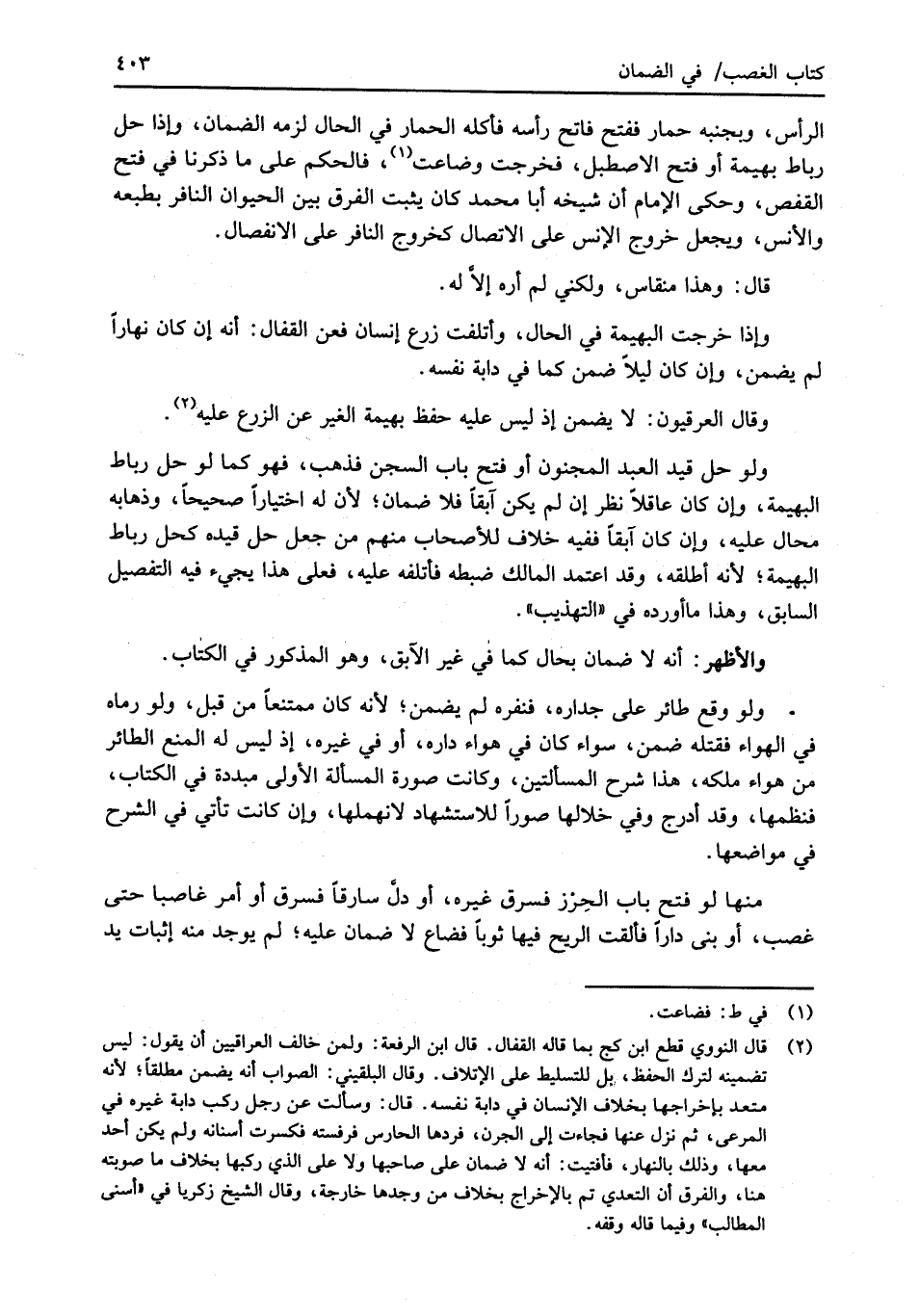 (¬2) قال النووي قطع ابن كج بما قاله القفال. قال ابن الرفعة: ولمن خالف العراقيين أن يقول: ليس تضمينه لترك الحفظ، بل للتسليط على الإتلاف. وقال البلقيني: الصواب أنه يضمن مطلقاً؛ لأنه متعد بإخراجها بخلاف الإنسان في دابة نفسه. قال: وسألت عن رجل ركب دابة غيره في المرعى، ثم نزل عنها فجاءت إلى الجرن، فردها الحارس فرفسته فكسرت أسنانه ولم يكن أحد معها، وذلك بالنهار، فأفتيت: أنه لا ضمان على صاحبها ولا على الذي ركبها بخلاف ما صوبته هنا، والفرق أن التعدي تم بالإخراج بخلاف من وجدها خارجة، وقال الشيخ زكريا في "أسنى المطالب" وفيما قاله وقفه.