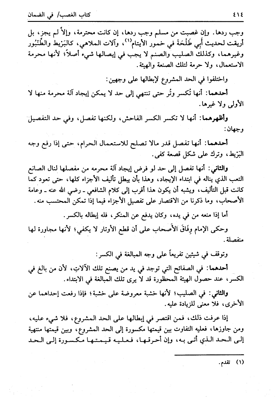والثاني: أنها تفصل إلى حد لو فرض إيجاد ألة محرمه من مفصلها لنال الصانع التعب الذي يناله في ابتداء الإيجاد، وهذا بأن يبطل تأليف الأجزاء كلها، حتى تعود كما كانت قبل التأليف، ويشبه أن يكون هذا أقرب إلى كلام الشَّافعي -رضي الله عنه- وعامة الأصحاب، وما ذكرنا من الاقتصار على تفصيل الأجزاء فيما إذا تمكن المحتسب منه.
