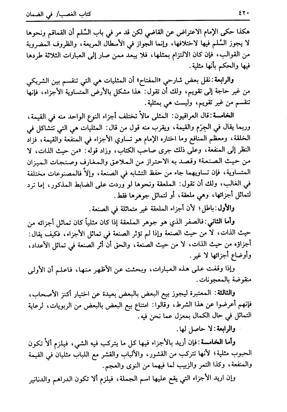 الخامسة: قال العراقيون: المثلى مالاً تختلف أجزاء النوع الواحد منه في القيمة، وربما يقال في الجِرْم والقيمة، ويقرب منه قول من قال: المثليات هي التي تتشاكل في الخلقة، ومعظم المنافع وما اختاره الإمام هو تساوي الأجزاء في المنفعة والقيمة، فزاد النظر إلى المنفعة، وعلى ذلك جرى صاحب الكتاب، وزاد قوله: "من حيث الذات، لا من حيث الصنعة" وقصد به الاحتراز من الملاعق والمغارف وصنجات الميزان المتساوية، فإن تساويهما جاء من حفظ التشابه في الصنعة، وإلاَّ فالمصنوعات مختلفة في الغالب، ولك أن تقول: الملعقة ونحوها لو وردت على الضابط المذكور، إما ترد لتماثل أجزائها، وهي ملعقة، أو لتماثل جوهرها فقط.