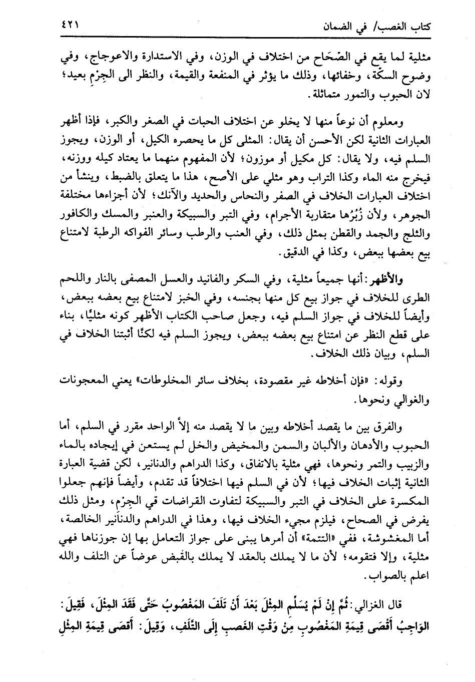 قال الغزالي: ثُمَّ إِنْ لَمْ يُسَلِّمِ المِثْلَ بَعْدَ أَنْ تَلَفَ المَغْصُوبُ حَتَّى فَقَدَ المِثْلَ، فَقِيلَ: الوَاجِبُ أَقْصَى قِيمَةِ المَغْصُوبِ مِنْ وَقْتِ الغَصبِ إِلَى التَّلَفِ، وَقِيلَ: أَقصَى قِيمَةِ المِثْلِ