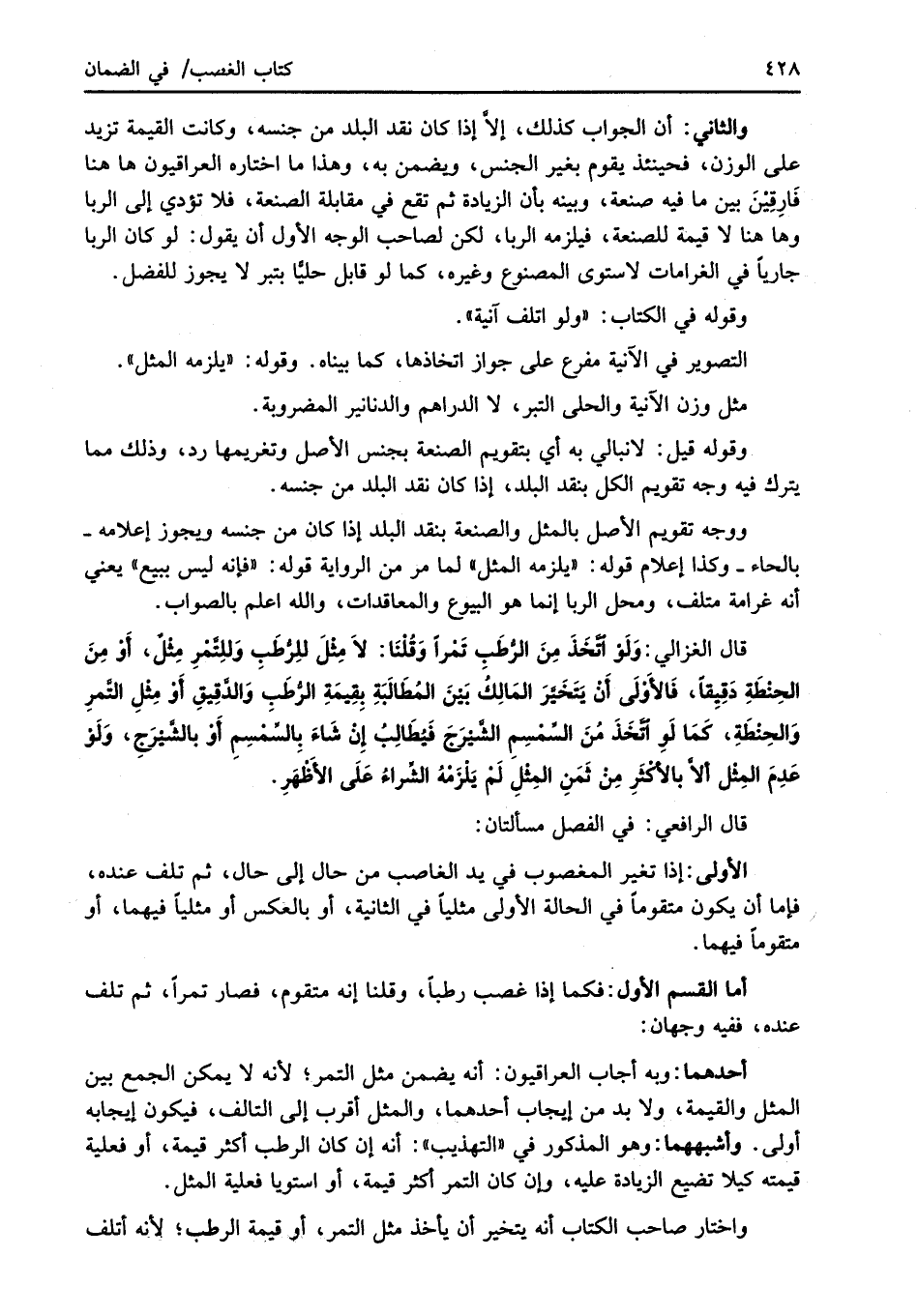 قال الغزالي: وَلَوْ اتَّخَذَ مِنَ الرُّطَبِ تَمْراً وَقُلْنَا: لاَ مِثْلَ للِرُّطَبِ وَللِتَّمْرِ مِثْلٌ، أَوْ مِنَ الحِنْطَةِ دَقِيْقاً، فَالأَوْلَى أَنْ يَتَخَيَّرَ المَالِكُ بَيْنَ المُطَالَبَةِ بِقِيمَةِ الرُّطَبِ وَالدَّقِيقِ أَوْ مِثْلِ التَّمرِ وَالحِنْطَةِ، كَمَا لَوِ اتَّخَذَ مُنَ السِّمْسِمِ الشَّيْرَجَ فَيُطَالِبُ إنْ شَاءَ بِالسِّمْسِمِ أَوْ بالشَّيْرَجِ، وَلَوْ عَدِمَ المِثْل إلاَّ بالأكْثَرِ من ثَمَنِ المِثْلِ لَمْ يَلْزَمْهُ الشِّراءُ عَلَى الأَظْهَرِ.