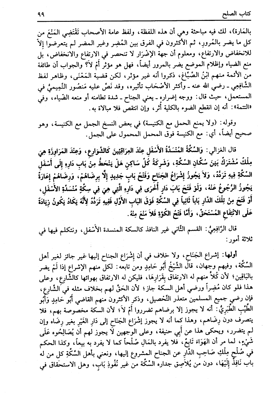 قال الغزالي: والسِّكَّةُ المُنْسَدَّةُ الأَسْفَلِ عنْدَ العِراقِيِّينَ كَالشَّوَارِعِ، وَعِنْدَ المَرَاوِزَةِ هِيَ مِلْكٌ مُشْتَرَك بَيْنَ سُكَّانِ السِّكَّةِ، وَشَرِكَةُ كُلِّ سَاكِنٍ هَلْ يَنْحَطُّ مِنْ بَابِ دَارِهِ إِلَى أَسْفَلِ السِّكَّةِ فِيهِ تَرَدُّدٌ، وَلا يَجُوزُ إِشْرَاعُ الجَنَاحِ وَفَتْحُ بَابٍ جَدِيدٍ إِلاَّ بِرِضَاهُمْ، وَرِضَاهُمْ إِعَارَةٌ يَجُوزُ الرُّجُوعُ عَنْهُ، وَلَوْ فَتَحَ بَابَ دَارٍ أُخْرَى في دَارِهِ الَّتِي هِيَ في سِكَّةٍ مُنْسَدَّةِ الأَسْفَلِ، أَوْ فَتَحَ مِنْ تِلْكَ الدَّارِ بابًا ثانِيًا في السِّكَّةِ فَوْقَ البَابِ الأَوَّلِ فَفِيهِ تَرَدُّدٌ لِأَنَّهُ يَكَادُ يَكُونُ زِيَادَةً عَلَى الانْتِفَاعِ المُسْتَحَقِّ، وَأَمَّا فَتْحُ الكُوَّةِ فَلا مَنْعَ مِنْهُ.