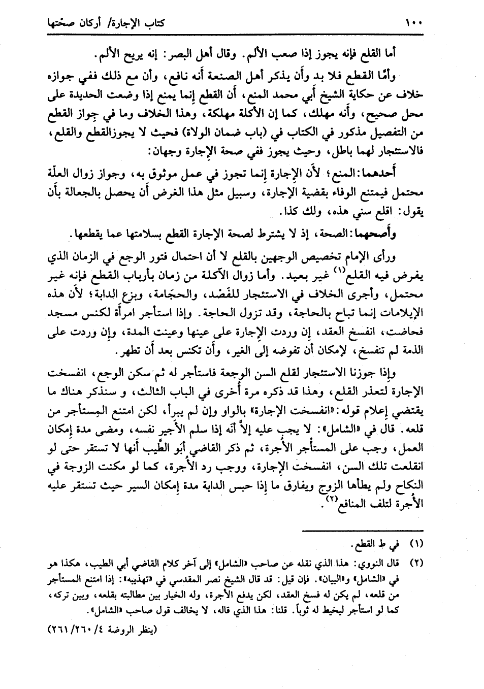 وأمَّا القطع فلا بد وأَن يذكر أهل الصنعة أَنه نافع، وأن مع ذلك ففي جوازه خلاف عن حكايته الشيخ أَبي محمد المنع، أَن القطع إِنما يمنع إذا وضعت الحديدة على محل صحيح، وأَنه مهلك، كما إن الأكله مهلكة، وهذا الخلاف وما في جِواز القطع من التفصيل مذكور في الكتاب في (باب ضمان الولاة) فحيث لا يجوز القطع والقلع، فالاستئجار لهما باطل، وحيث يجوز ففي صحة الإِجارة وجهان: