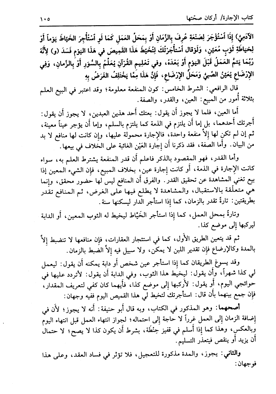 قال الرافعي: الشرط الخامس: كون المنفعة معلومة؛ وقد اعتبر في البيع العلم بثلاثة أُمور من المبيع: العين، والقدر، والصفة.