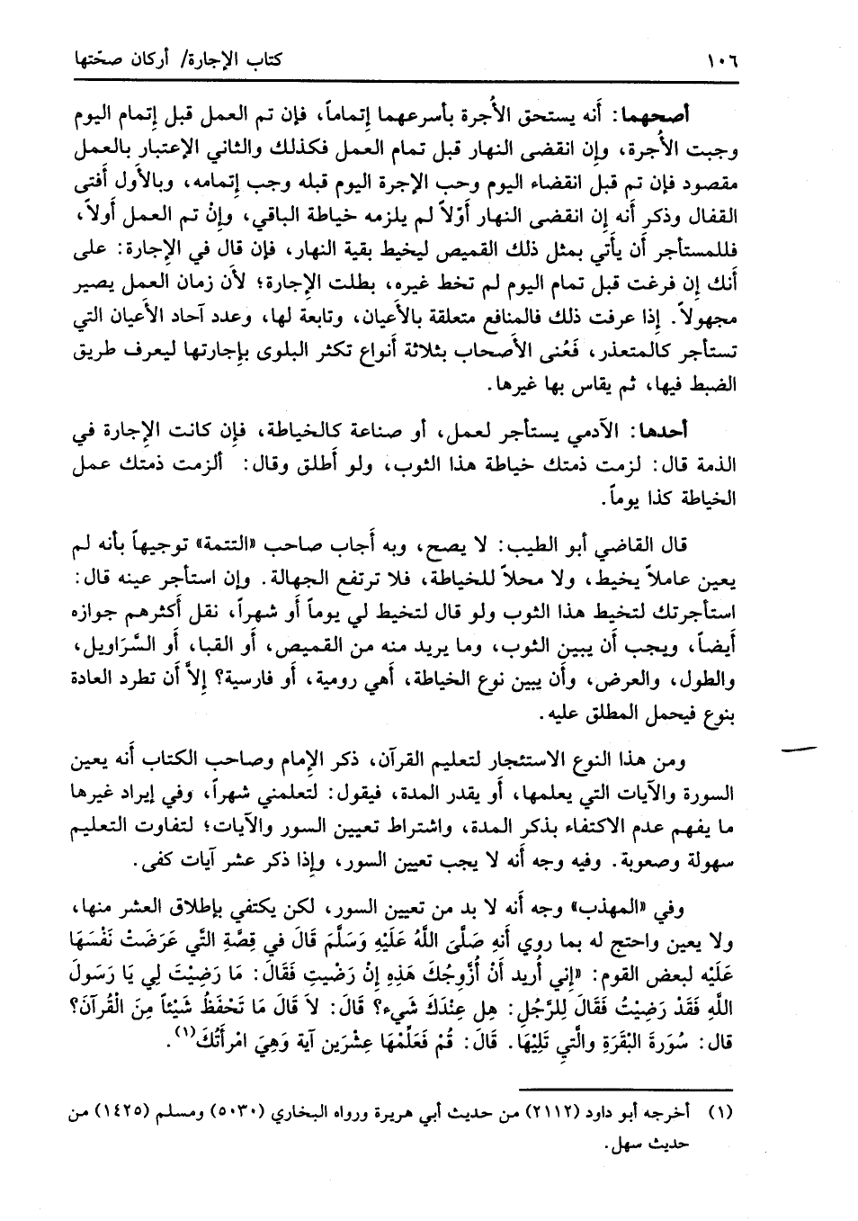 ومن هذا النوع الاستئجار لتعليم القرآن، ذكر الإمام وصاحب الكتاب أَنه يعين السورة والآيات التي يعلمها، أَو يقدر المدة، فيقول: لتعلمني شهراً، وفي إيراد غيرها ما يفهم عدم الاكتفاء بذكر المدة، واشتراط تعيين السور والآيات؛ لتفاوت التعليم سهولة وصعوبة. وفي وجه أَنه لا يجب تعيين السور, وإذا ذكر عشر آيات كفى.