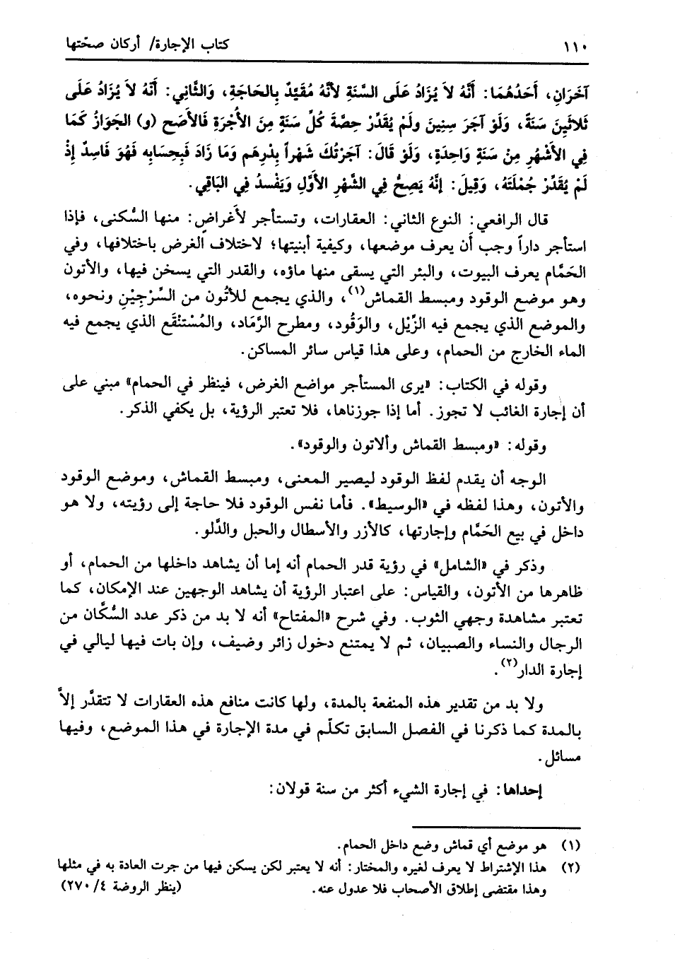 قال الرافعي: النوع الثاني: العقارات، وتستاجر لأَغراضٍ: منها السُّكنى، فإذا استأجر داراً وجب أَن يعرف موضعها، وكيفية أبنيتها؛ لاختلاف الغرض باختلافها، وفي الحَمَّام يعرف البيوت، والبئر التي يسقى منها ماؤه، والقدر التي يسخن فيها، والأتون وهو موضع الوقود ومبسط القماش (¬1)، والذي يجمع للأتُون من السَّرْجِيْنِ ونحوه، والموضع الذي يجمع فيه الزّيْل، والوَقُود، ومطرح الرَّمَاد، والمُسْتنْقَع الذي يجمع فيه الماء الخارج من الحمام، وعلى هذا قياس سائر المساكن.