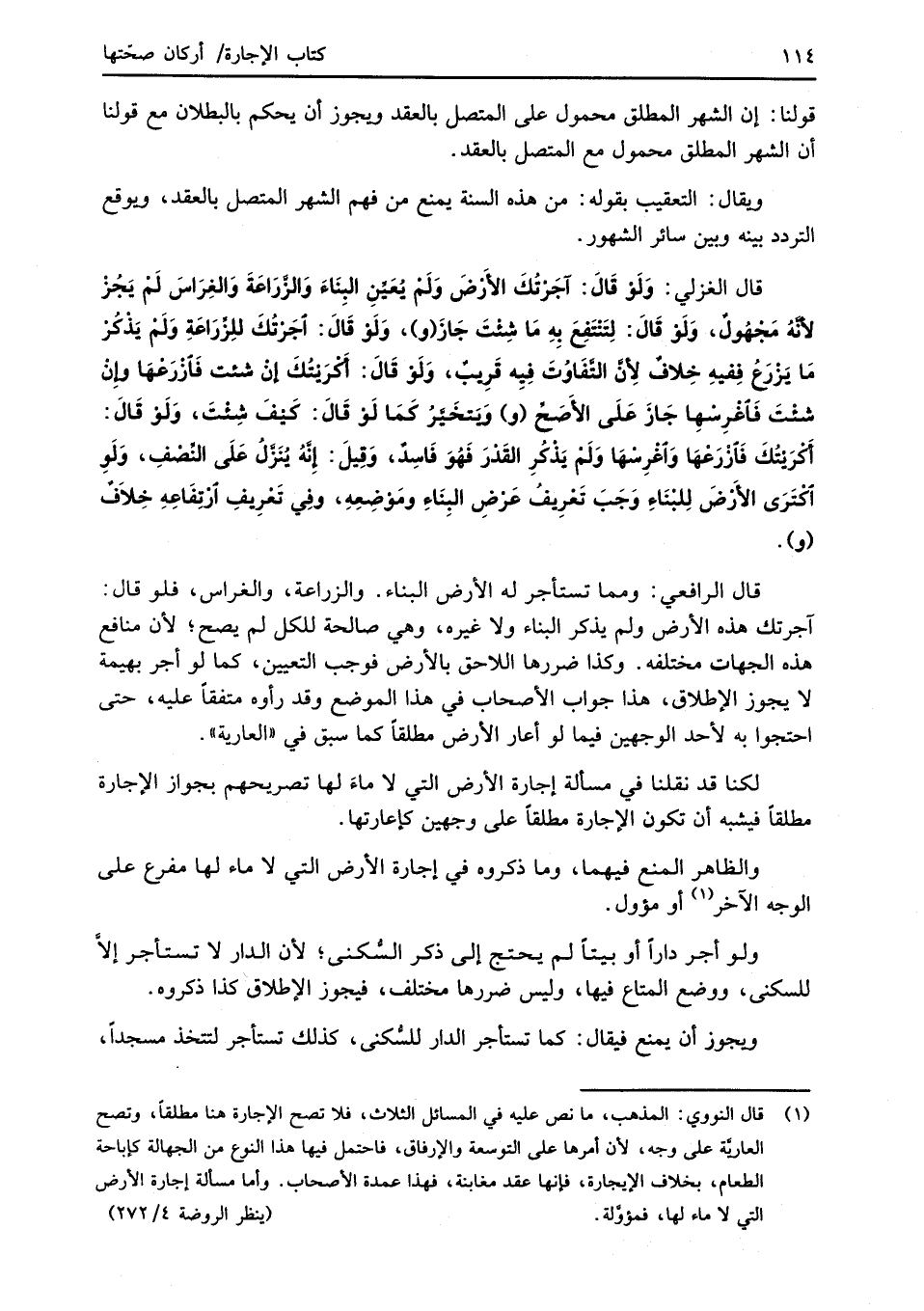 قال الرافعي: ومما تستأجر له الأرض البناء. والزراعة، والغراس، فلو قال: آجرتك هذه الأرض ولم يذكر البناء ولا غيره، وهي صالحة للكل لم يصح؛ لأن منافع هذه الجهات مختلفه. وكذا ضررها اللاحق بالأرض فوجب التعيين، كما لو أجر بهيمة لا يجوز الإطلاق، هذا جواب الأصحاب في هذا الموضع وقد رأوه متفقاً عليه، حتى احتجوا به لأحد الوجهين فيما لو أعار الأرض مطلقاً كما سبق في "العارية".