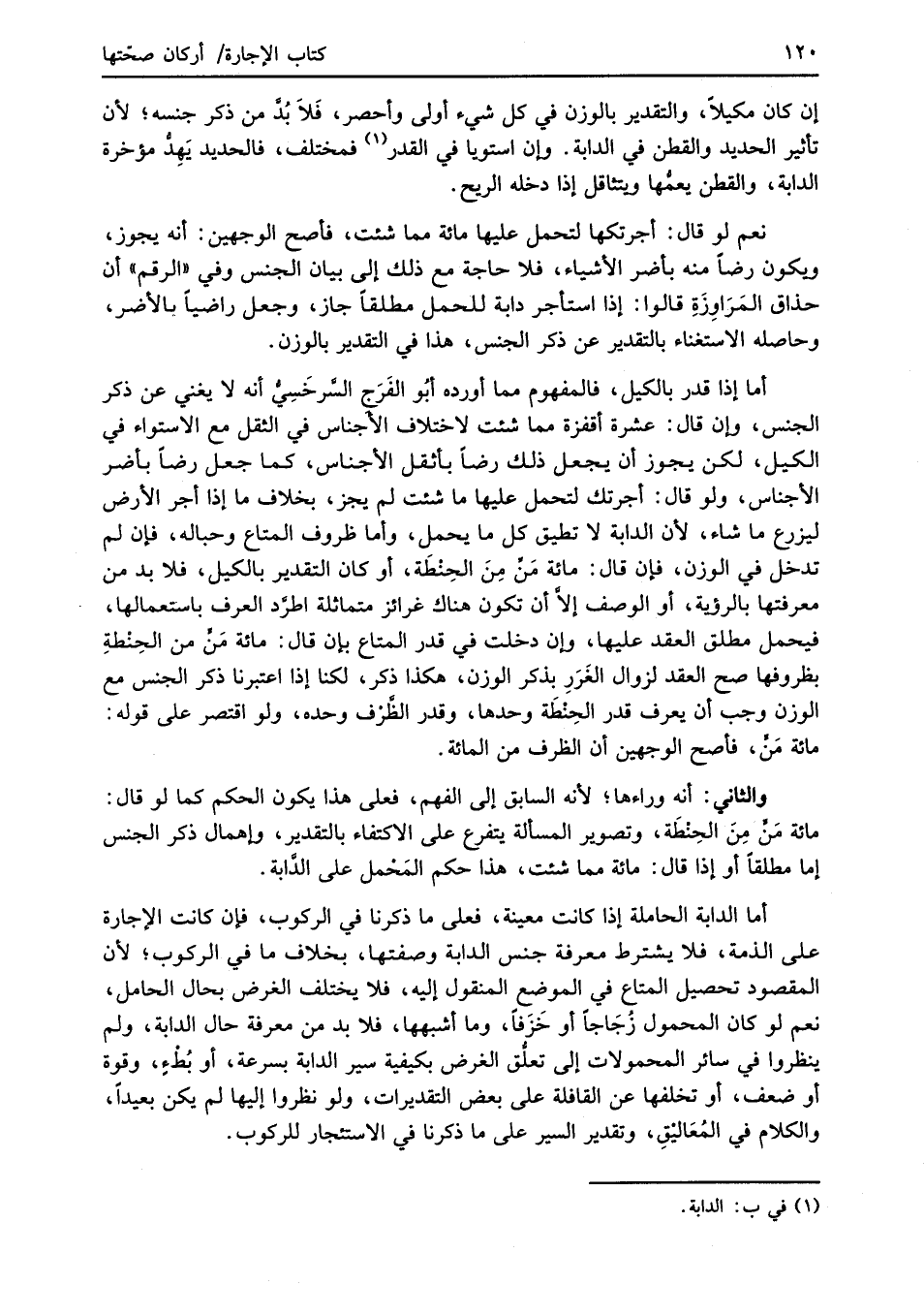 إن كان مكيلاً، والتقدير بالوزن في كل شيء أولى وأحصر، فَلاَ بُدَّ من ذكر جنسه؛ لأن تأثير الحديد والقطن في الدابة. وإن استويا في القدر (¬1) فمختلف، فالحديد يَهِدُّ مؤخرة الدابة، والقطن يعمُّها ويتثاقل إذا دخله الريح.