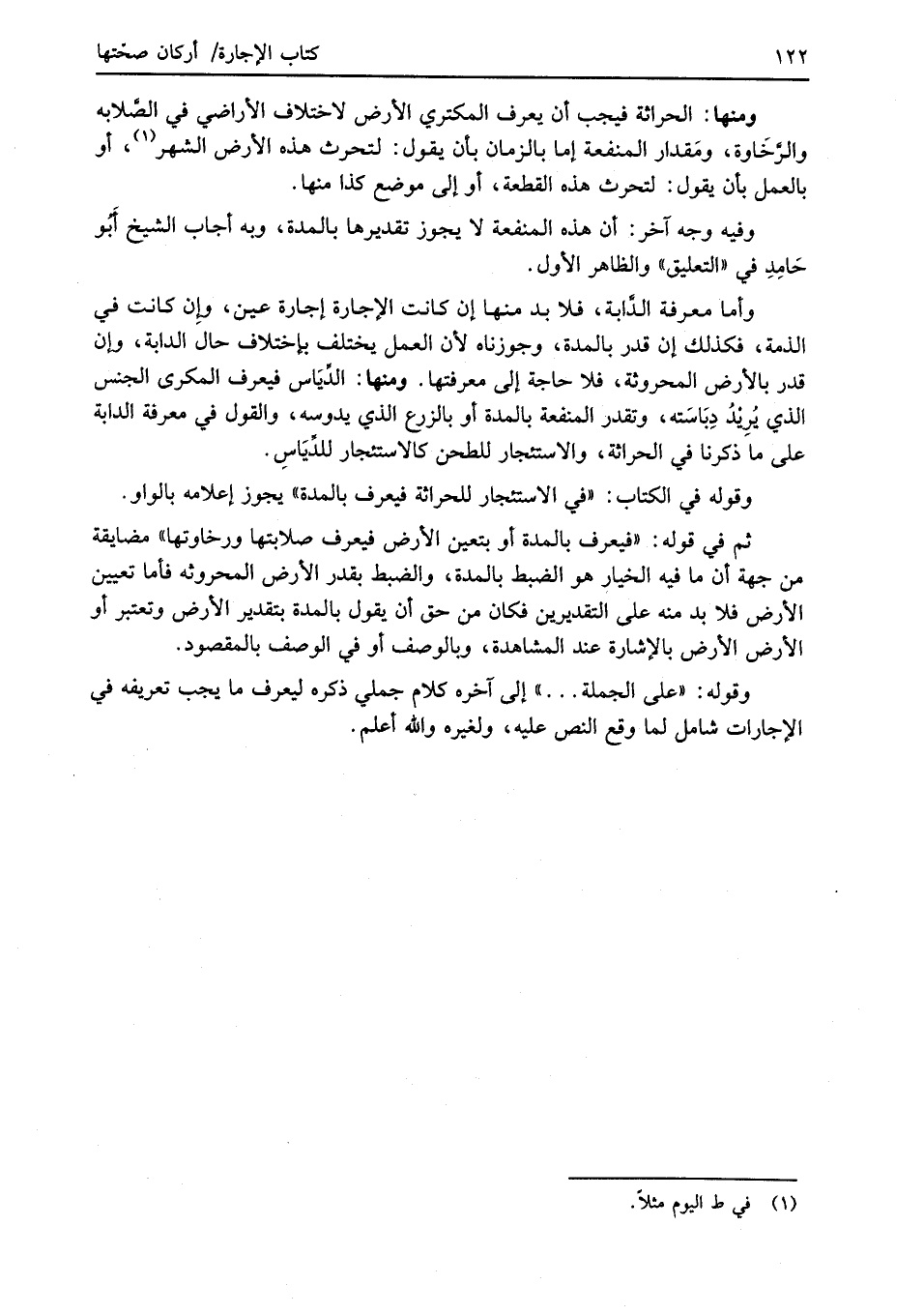 ثم في قوله: "فيعرف بالمدة أو بتعين الأرض فيعرف صلابتها ورخاوتها" مضايقة من جهة أن ما فيه الخيار هو الضبط بالمدة، والضبط بقدر الأرض المحروثه فأما تعيين الأرض فلا بد منه على التقديرين فكان من حق أن يقول بالمدة بتقدير الأرض وتعتبر أو الأرض الأرض بالإشارة عند المشاهدة، وبالوصف أو في الوصف بالمقصود.
