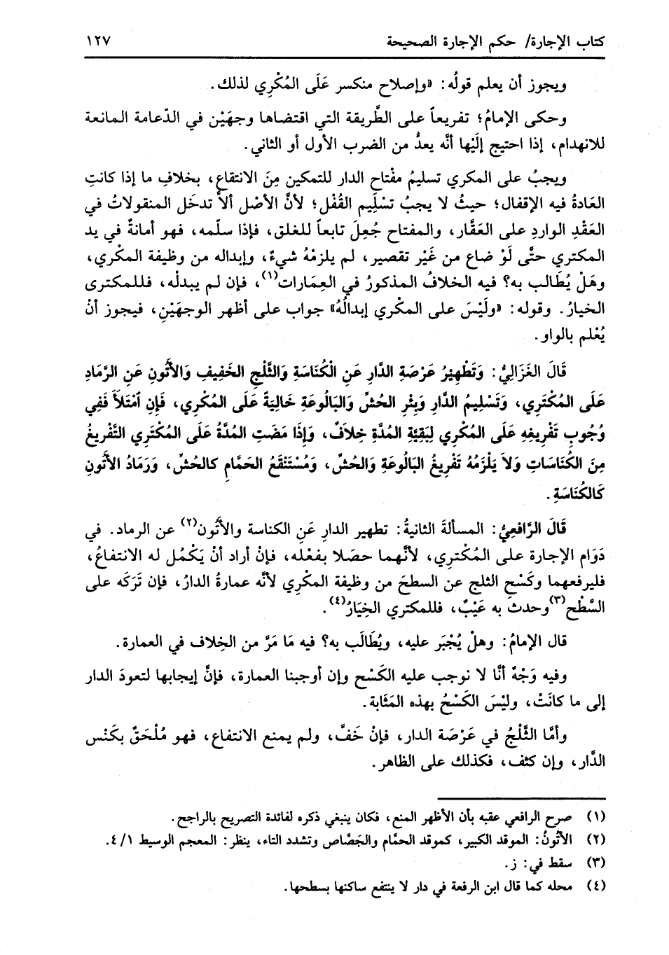 قَالَ الغَزَالِيُّ: وَتَطْهِيْرُ عَرْصَةِ الدَّارِ عَنِ الْكُنَاسَةِ وَالثَّلْجِ الخَفِيفِ وَالأَتُونِ عَنِ الرَّمَادِ عَلَى المُكْتَرِي، وَتَسْلِيمُ الدَّارِ وَبِئْرِ الحُشِّ وَالبَالُوعَةِ خَالِيَةً عَلَى المُكْرِي، فَإنِ امْتَلأَ فَفِي وُجُوبِ تَفْرِيغِهِ عَلَى المُكْرِي لِبَقِيَّةِ المُدَّةِ خِلاَفٌ، وَإذَا مَضَتِ المُدَّةُ عَلَى المُكْتَرِي التَّفْريغُ مِنَ الكُنَاسَاتِ وَلاَ يَلْزَمُهُ تَفْرِيغُ البَالُوعَةِ وَالحُشِّ، وَمُسْتَنْقَعُ الحَماَّمِ كالحُشِّ، وَرَمَادُ الأتُونِ كَالكُنَاسَةِ.