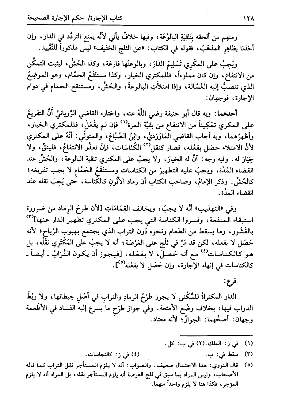 (¬5) قال النووي: هذا الاحتمال ضعيف. والصواب: أنه لا يلزم المستأجر نقل التراب كما قاله الأصحاب، وليس المراد بما سبق في ثلج العرصة أنه يلزم المستأجر نقله، بل المراد أنه لا يلزم المؤجر، فكذا هنا لا يلزم واحداً منهما.