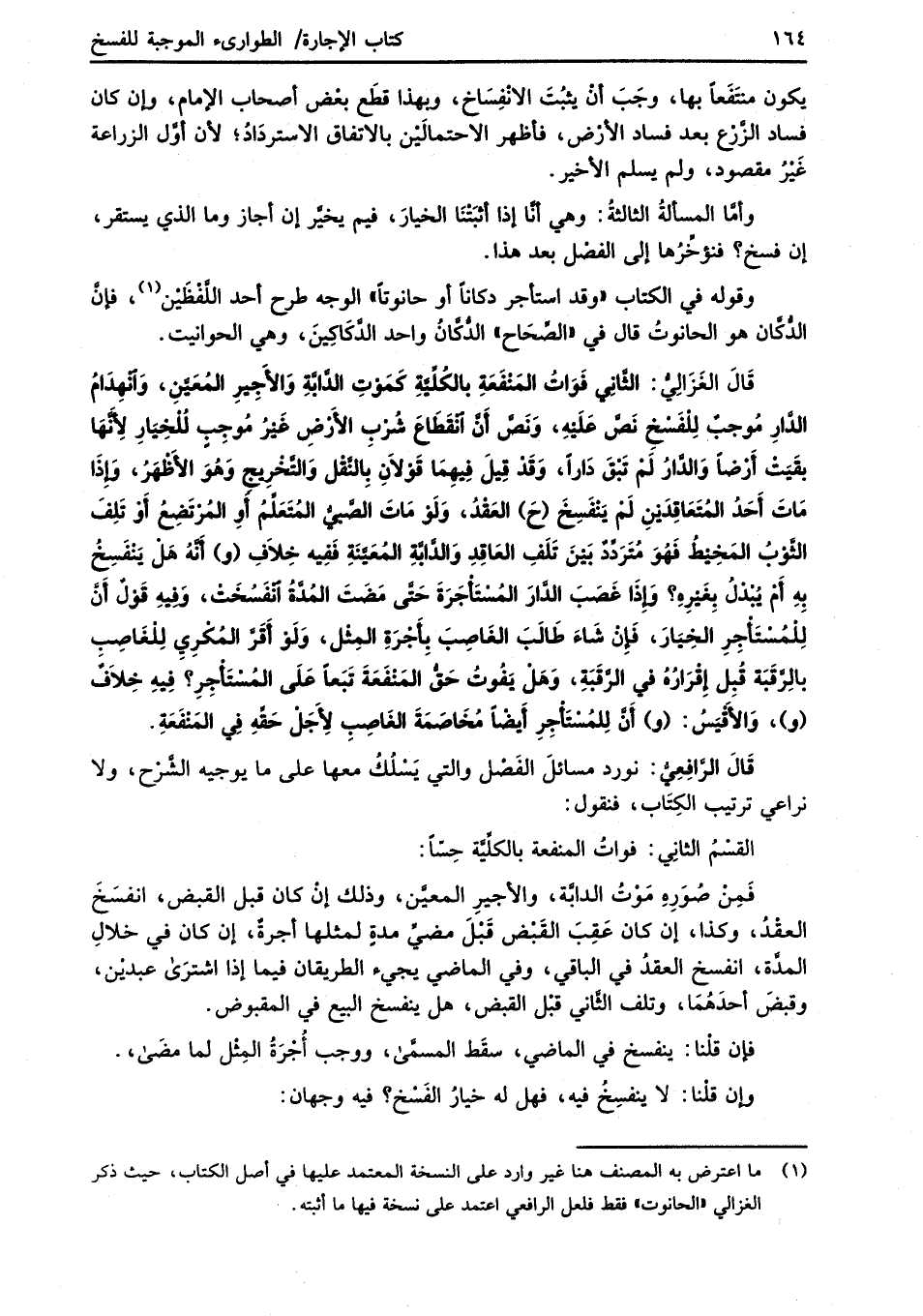 قَالَ الغَزَالِيُّ: الثَّاني فَوَاتُ المَنْفَعَةِ بالكُلِّيَّةِ كَمَوْتِ الدَّابَّةِ وَالأَجِيرِ المُعَيَّنِ، وَانْهِدَامُ الدَّارِ مُوجبٌ لِلْفَسْخِ نَصَّ عَلَيْهِ، وَنَصَّ أَنَّ انْقَطَاعَ شُرْبِ الأَرْضِ غَيْرُ مُوجِبٍ لُلْخِيَارِ لِأَنَّهَا بقَيَتْ أَرْضاً وَالدَّارُ لَمْ تَبقَ دَاراً، وَقَدْ قِيلَ فِبهِمَا قَوْلاَنِ بِالنَّقْل وَالتَّخْرِيج وَهُوَ الأَظْهَرُ، وَإِذَا مَاتَ أَحَدُ المُتَعَاقِدَبنِ لَمْ يَنْفَسِخَ (حَ) العَقْدُ، وَلَوْ مَاتَ الصَّبيُّ المُتَعَلِّمُ أَوِ المُرْتَضِعُ أَوْ تَلِفَ الثَّوْبُ المَخِيْطُ فَهُوَ مُتَرَدِّدٌ بَيْنَ تَلَفِ العَاقِدِ وَالدَّابَّةِ المُعَيَّنَةِ فَفِيه خِلاَفِ (و) أَنَّهُ هَلْ يَنْفَسِخُ بِهِ أَمْ يُبْدَلُ بِغَيْرِهِ؟ وَإذَا غَصَبَ الدَّار المُسْتَأجَرَةَ حَتَّى مَضَتَ المُدَّةُ انْفَسُخَتْ، وَفِيهِ قَوْلٌ أَنَّ لِلْمُسْتَأجِرِ الخِيَارَ، فَإِنْ شَاءَ طَالَبَ الغَاصِبَ بِأَجْرَةِ المِثْل، وَلَوْ أَقَرَّ المُكْرِيِ لِلْغَاصِب بالِرَّقَبَة قُبِل إِقْرَارُهُ في الرَّقَبَةِ، وَهَلْ يَفُوتُ حَقُّ المَنْفَعَةَ تَبَعاً علَى المُسْتَأْجِرِ؟ فِبهِ خِلاَفٌ (و)، وَالأَقْيَسُ: (و) أَنَّ لِلمُسْتَأْجِرِ أَيضْاً مُخَاصَمَةَ الغَاصِبِ لِأَجَلْ حَقِّهِ في المَنْفَعَةِ.