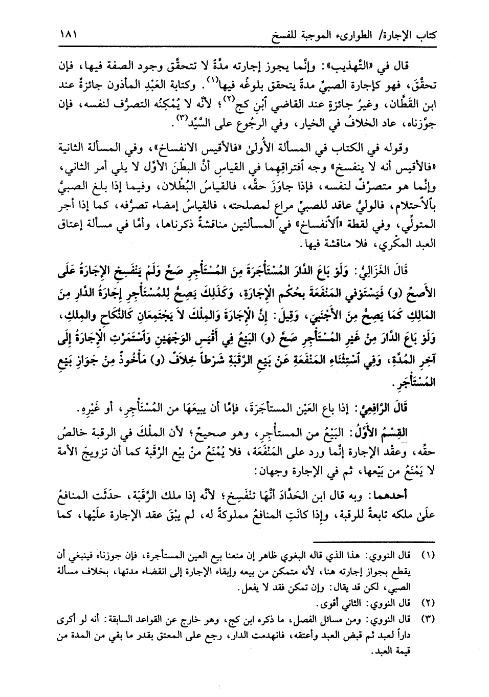 (¬1) قال النووي: هذا الذي قاله البغوي ظاهر إن منعنا بيع العين المستأجرة، فإن جوزناه فينبغي أن يقطع بجواز إجارته هنا؛ لأنه متمكن من بيعه وإبقاء الإجارة إلى انقضاء مدتها، بخلاف مسألة الصبي، لكن قد يقال: وإن تمكن فقد لا يفعل.