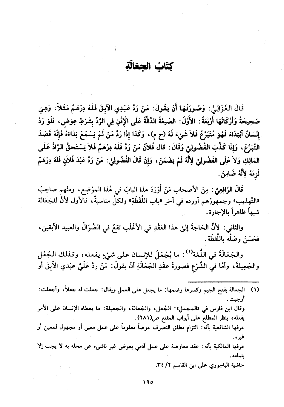 (¬1) الجعالة بفتح الجيم وكسرها وضمها: ما يجعل على العمل ويقال: جعلت له جعلاً، وأجعلت: أوجبت.