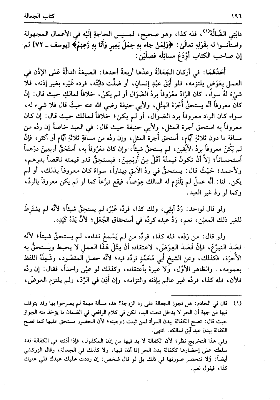 أَحَدُهُمَا: في أركان الجَعَالَةُ وعدَّها أربعةً أحدها: الصيغةُ الدالَّةُ عَلى الإذْن في العمل بعَوَضٍ يلتزمه، فلو أَبَقَ عبْدٍ إِنسانٍ، أو ضلَّت دابَّتُه، فرده غَيْره بغير إذنه، فلا شيْءُ لهُ سواء، كان الرَّادّ معْرُوفاً بردِّ الضّوَال أو لم يكنْ، خلافاً لمالكٍ حيث قال: إنْ كان معروفاً أنَّه يستحقُّ أُجْرَةَ المِثْلِ، ولأبي حنيفة رضي الله عنه حيثُ قال فلا شيء له، سواء كان الراد معروفاً برد الضوال، أو لم يكن؛ خلافاً لمالك حيث قال: إن كان معروفاً به استحق أجرة المثل، ولأبي حنيفة حيث قال: في العبد خاصةً إن ردَّه من مسافة ما دون ثلاثةٍ أيَّام، استحق أُجرة المثل، وإن ردَّه من مسافةِ ثلاثَةِ أيَّام أو أكثر، فإنْ لم يَكُنْ معروفًا بردِّ الآبقين، لم يستحقَّ شيئاً، وإن كان معْرُوفاً به، استَحَقَّ أربعِينَ درْهماً استحساناً؛ إلاَّ أنْ تكونَ قيمتُهُ أقَلَّ مِنْ أَربَعِينَ، فيستحِقُّ قدر قيمته ناقصاً بدرهم، ولأحمد؛ حَيْثُ قال: يستحقُّ في ردِّ الآبقِ دِيناراً، سواءٌ كان معروفًا بذلك، أو لم يكن. لنا: أنَّه عملٌ لم يَلْتَزِم له المالك عِوَضاً، فيقع تبرُّعاً كما لو لم يكن معروفاً بالردِّ، وكما لو ردَّ غير العبد.