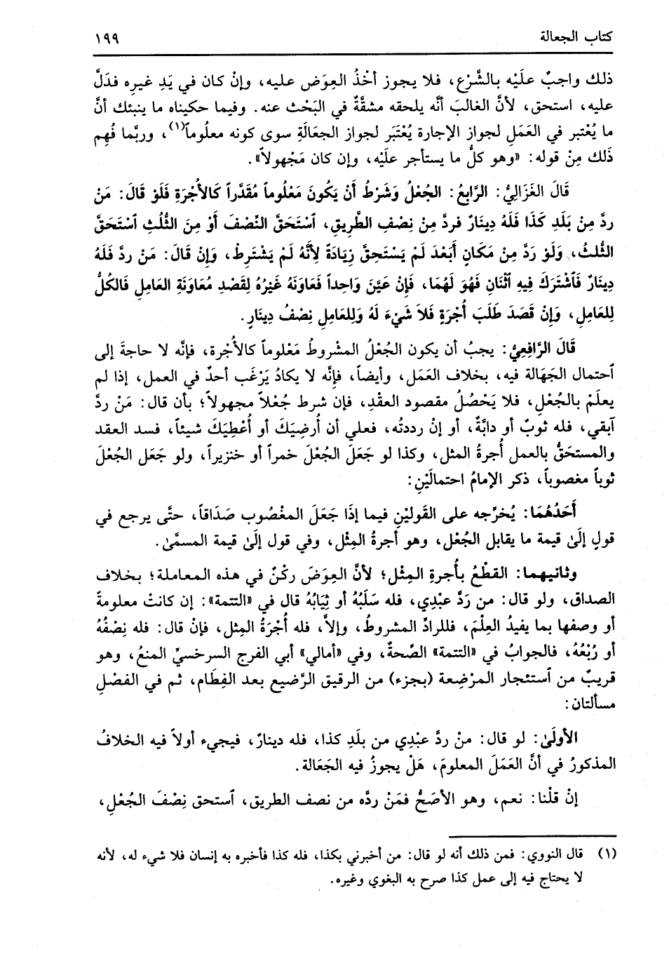 قَالَ الغَزَالِيُّ: الرَّابعُ: الجُعْلُ وَشَرْطُ أَنْ يَكُونَ مَعْلُوماً مُقَدَّراً كَالأُجْرَةِ فَلَوْ قَالَ: مَنْ ردَّ مِنْ بَلَدِ كَذَا فَلَهُ دِينَارٌ فردَّ من نِصْفِ الطَّرِيقِ، اسْتَحَقَّ النِّصْفَ أَوْ مِنَ الثُّلُثِ اسْتَحَقَّ الثُّلثُ، وَلَوْ رَدَّ مِنْ مَكَانٍ أَبَعْدَ لَمْ يَسْتَحِقَّ زِيَادَةً لأَنهُ لَمْ يَشْتَرِطْ، وَإنْ قَالَ: مَنْ ردَّ فَلَهُ دِينَارٌ فَاشْتَرَكَ فِيهِ اثنَانِ فَهُوَ لَهُمَا، فَإِنْ عَيَّنَ وَاحِداً فَعَاوَنَهُ غَيْرُهُ لِقَصْدِ مُعَاوَنَةِ العَامِلِ فَالكُلُّ لِلعَامِلِ، وَإِنْ قَصَدَ طَلَبَ أُجْرَةٍ فَلاَ شَيْءَ لَهُ وَلِلعَامِلِ نِصْفُ دِينَارٍ.