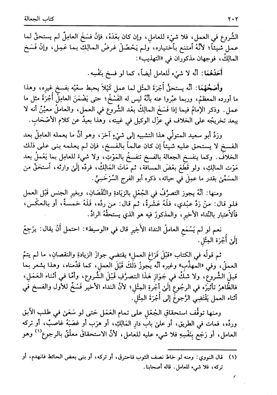 (¬1) قال النووي: ومنه لو خاط نصف الثوب فاحترق، أو تركه، أو بني بعض الحائط فانهدم، أو تركه، فلا شيء للعامل. قاله أصحابنا.
