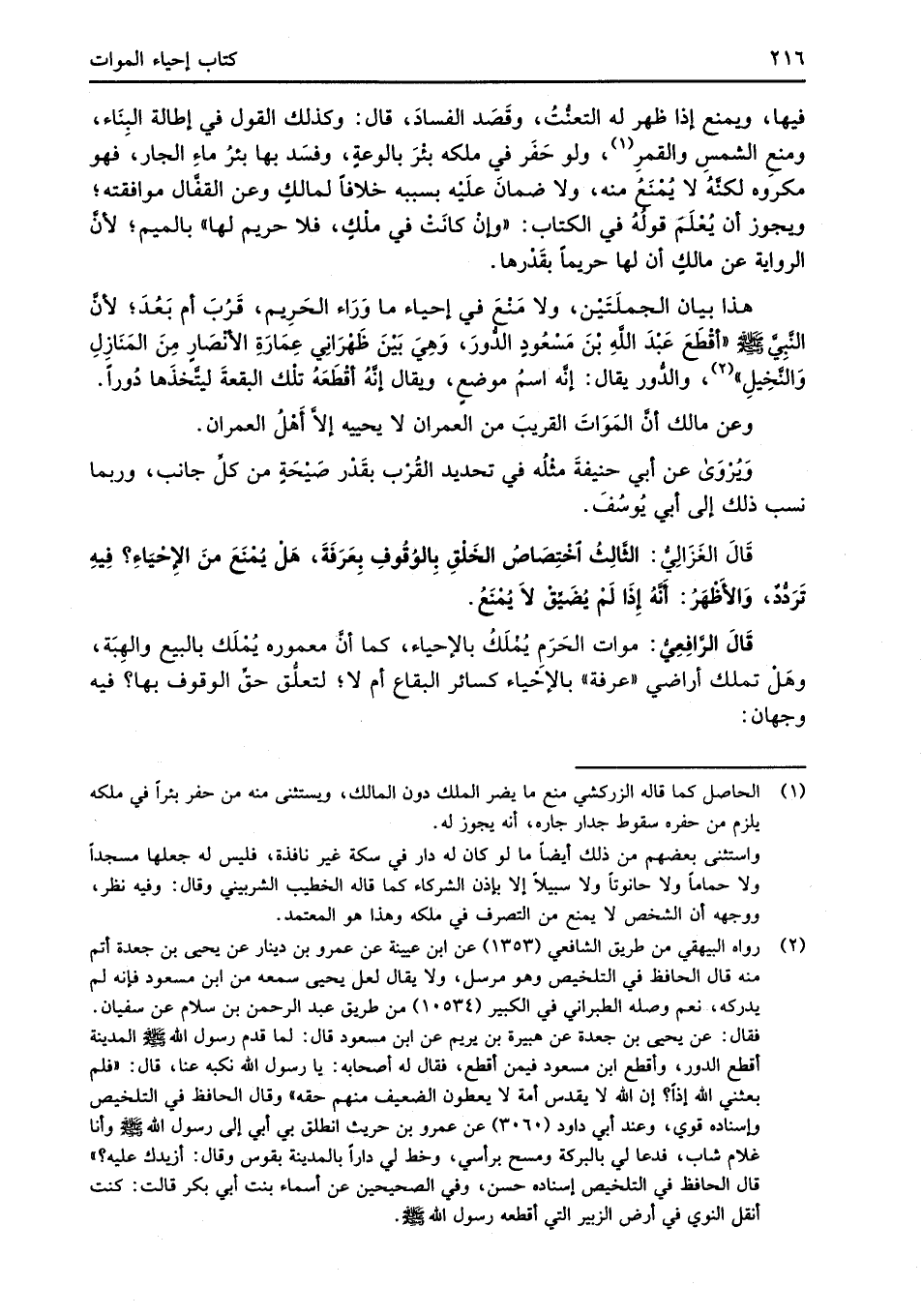 (¬2) رواه البيهقي من طريق الشَّافعي (1353) عن ابن عيينة عن عمرو بن دينار عن يحيى بن جعدة أتم منه قال الحافظ في التلخيص وهو مرسل، ولا يقال لعل يحيى سمعه من ابن مسعود فإنه لم يدركه، نعم وصله الطبراني في الكبير (10534) من طريق عبد الرحمن بن سلام عن سفيان. فقال: عن يحيى بن جعدة عن هبيرة بن يريم عن ابن مسعود قال: لما قدم رسول الله -صلى الله عليه وسلم- المدينة أقطع الدور، وأقطع ابن مسعود فيمن أقطع، فقال له أصحابه: يا رسول الله نكبه عنا، قال: "فلم بعثني الله إذاً؟ إن الله لا يقدس أمة لا يعطون الضعيف منهم حقه" وقال الحافظ في التلخيص وإسناده قوي، وعند أبي داود (3060) عن عمرو بن حريث انطلق بي أبي إلى رسول الله -صلى الله عليه وسلم- وأنا غلام شاب، فدعا لي بالبركة ومسح برأسي، وخط لي داراً بالمدينة بقوس وقال: أزيدك عليه؟ " قال الحافظ في التلخيص إسناده حسن، وفي الصحيحين عن أسماء بنت أبي بكر قالت: كنت أنقل النوي في أرض الزبير التي أقطعه رسول الله -صلى الله عليه وسلم-.