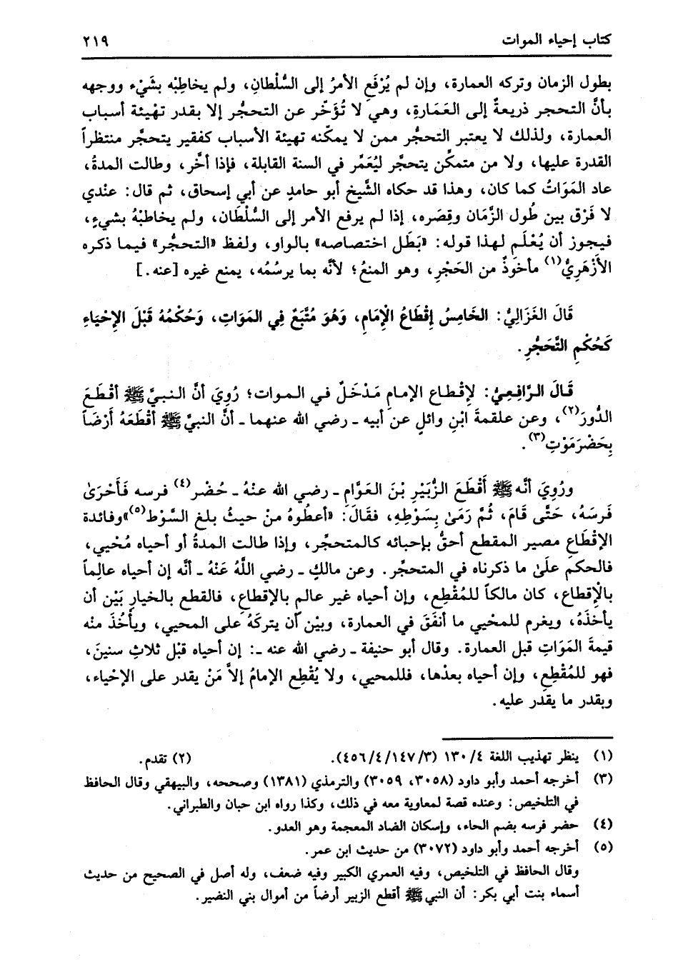 قَالَ الغَزَالِيُّ: الخَامِسُ إِقْطَاعُ الإِمَامِ، وَهُوَ مُتَّبَعٌ في المَوَاتِ، وَحُكْمُهُ قَبْلَ الإِحْيَاءِ كَحُكْمِ التَّحَجُّرِ.
