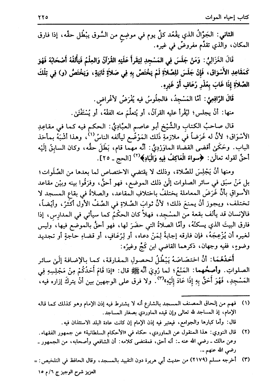 قَالَ الرَّافِعِيُّ: أمَّا المَسْجِدُ، فالجلُوسُ فيه يُفْرَضُ لأغْراضٍ.
