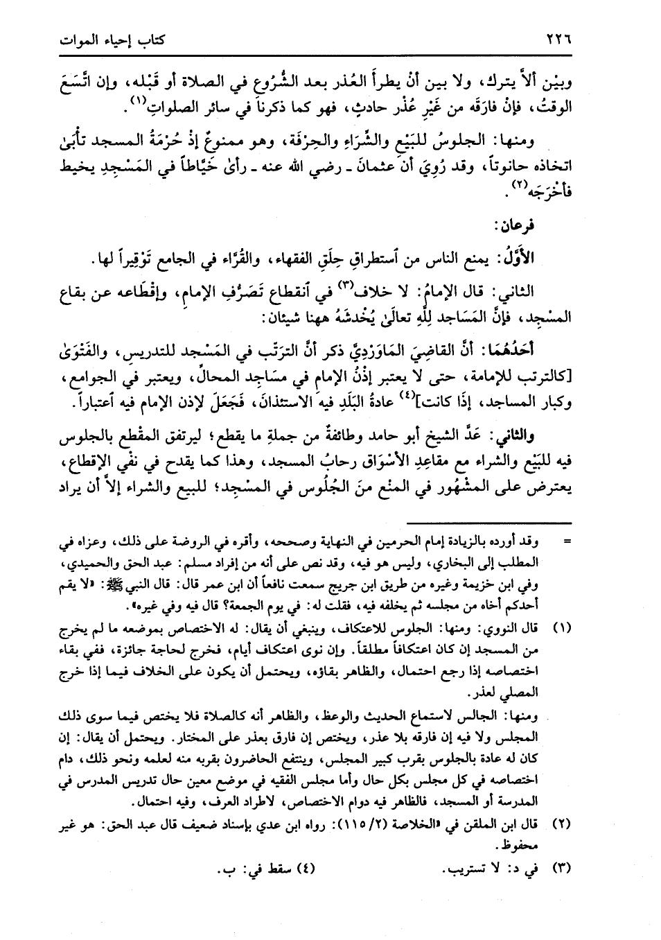 والثاني: عَدَّ الشيخ أبو حامد وطائفةٌ من جملةِ ما يقطع؛ ليرتفق المقْطع بالجلوس فيه للبَيْع والشراء مع مقاعِدِ الأسْوَاق رحابُ المسجد، وهذا كما يقدح في نفْي الإقطاع، يعترض على المشْهُور في المنْع منَ الجُلُوس في المسْجِد؛ للبيع والشراء إلاَّ أن يراد