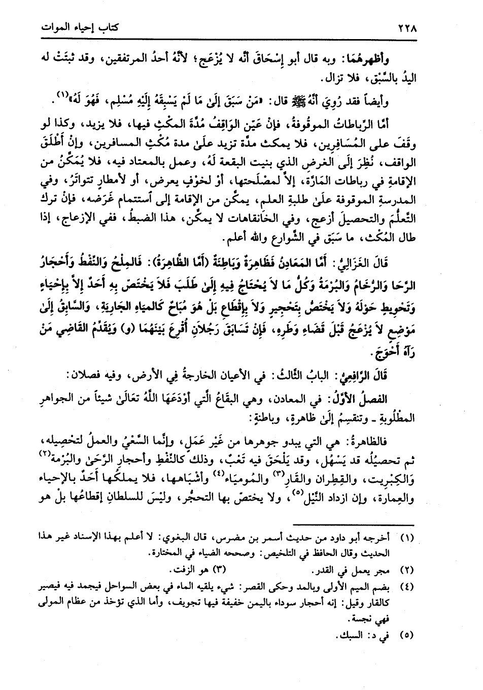 قَالَ الغَزَالِيُّ: أَمَّا المَعَادِنُ فَظَاهِرَةٌ وَبَاطِنَةٌ (أَمَّا الظَّاهِرَةُ): فَالمِلْحُ وَالنِّفْطُ وَأَحْجَارُ الرَّحَا وَالرُّخَامُ وَالبُرْمَةُ وَكُلُّ مَا لاَ يُحْتَاجُ فِيهِ إِلَى طَلَبَ فلاَ يَخْتَصّ بِهِ أَحَدٌ إلاَّ بِإِحْيَاءٍ وَتَحْوِيطٍ حَوْلَهُ وَلاَ يَخْتَصُّ بِتَحْجِير وَلاَ بِإقْطَاعِ بَلْ هُوَ مُبَاحٌ كَالميَاهِ الجَارِيَةِ، وَالسَّابِقُ إِلَى مَوْضِع لاَ يُزْعَجُ قَبْلَ قَضَاءِ وَطَرِهِ، فَإِنْ تَسَابَقَ رَجُلاَنِ أُقْرِعَ بَيْنَهُمَا (و) وَيقَدِّمُ القَاضِي مَنْ رَآهُ أَحْوَجَ.