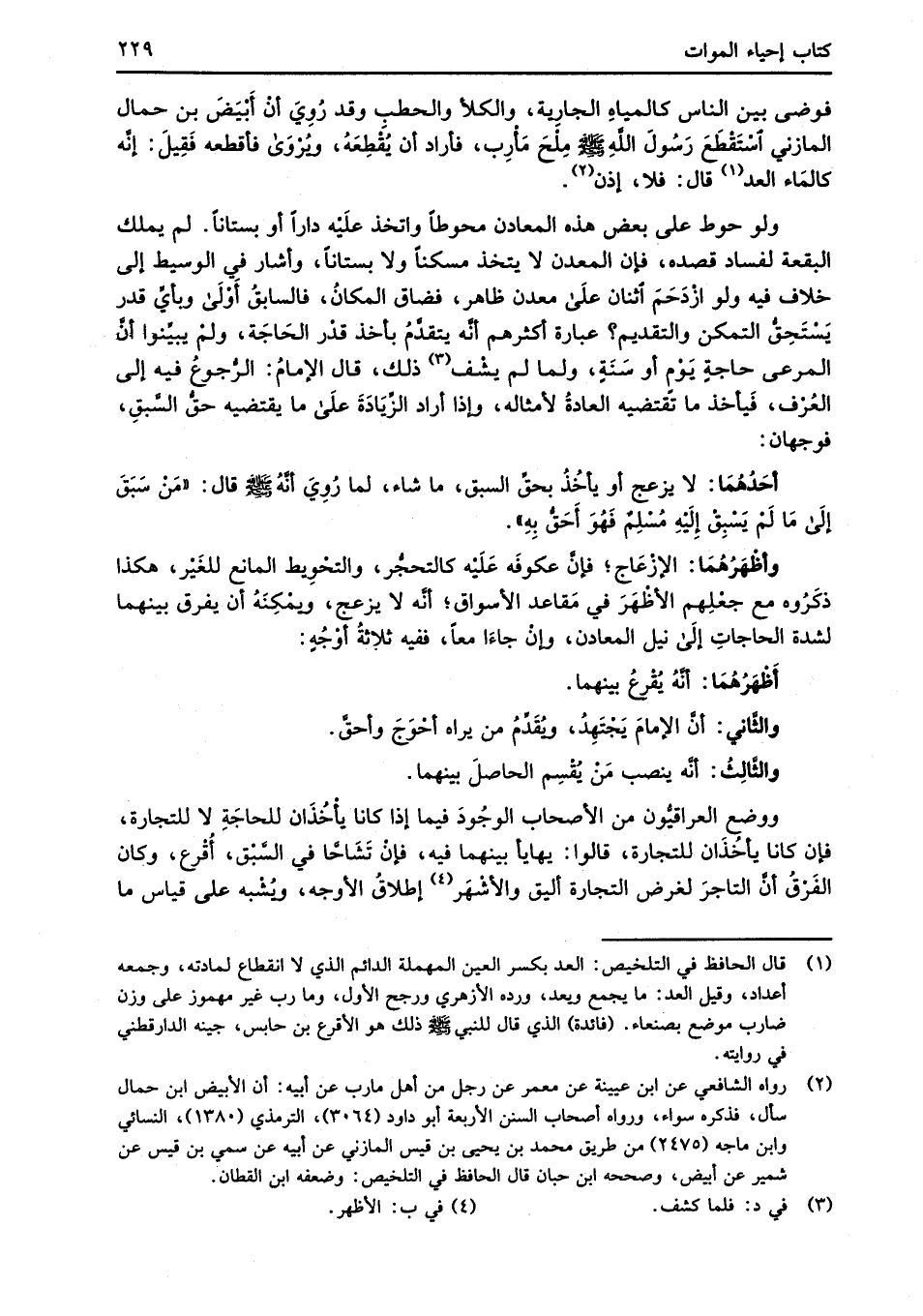 فوضى بين الناس كالمياهِ الجارية، والكلأ والحطب وقد رُوِيَ أنْ أَبْيَضَ بن حمال المازني اسْتَقْطَعَ رَسُول اللهِ -صلى الله عليه وسلم- مِلْحَ مَأْرِب، فأراد أن يُقْطِعَهُ، وُيرْوَى فأقطعه فَقِيلَ: إنَّه كالمَاء العد (¬1) قال: فلا، إذن (¬2).