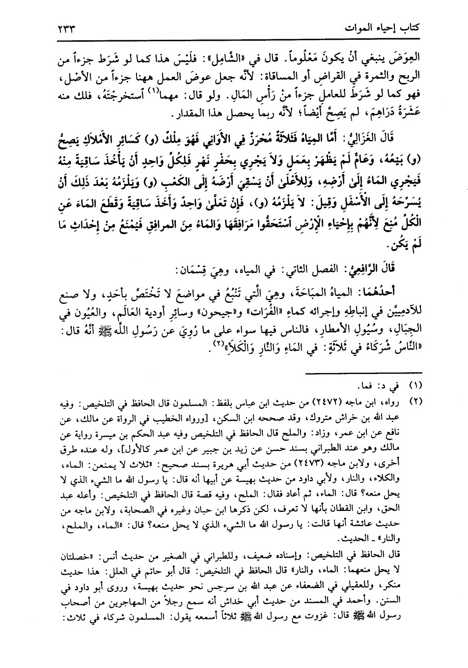 (¬2) رواه، ابن ماجه (2472) من حديث ابن عباس بلفظ: المسلمون قال الحافظ في التلخيص: وفيه عبد الله بن خراش متروك، وقد صححه ابن السكن، [ورواه الخطيب في الرواة عن مالك، عن نافع عن ابن عمر، وزاد: والملح قال الحافظ في التلخيص وفيه عبد الحكم بن ميسرة رواية عن مالك وهو عند الطبراني بسند حسن عن زيد بن جبير عن ابن عمر كالأول]، وله عنده طرق أخرى، ولابن ماجه (2473) من حديث أبي هريرة بسند صحيح: "ثلاث لا يمنعن: الماء، والكلاء، والنار، ولأبي داود من حديث بهيسة عن أبيها أنَّه قال: يا رسول الله ما الشيء الذي لا يحل منعه؟ قال: الماء، ثم أعاد فقال: الملح، وفيه قصة قال الحافظ في التلخيص: وأعله عبد الحق، وابن القطان بأنها لا تعرف، لكن ذكرها ابن حبان وغيره في الصحابة، ولابن ماجه من حديث عائشة أنها قالت: يا رسول الله ما الشيء الذي لا يحل منعه؟ قال: "الماء، والملح، والنار" -الحديث.