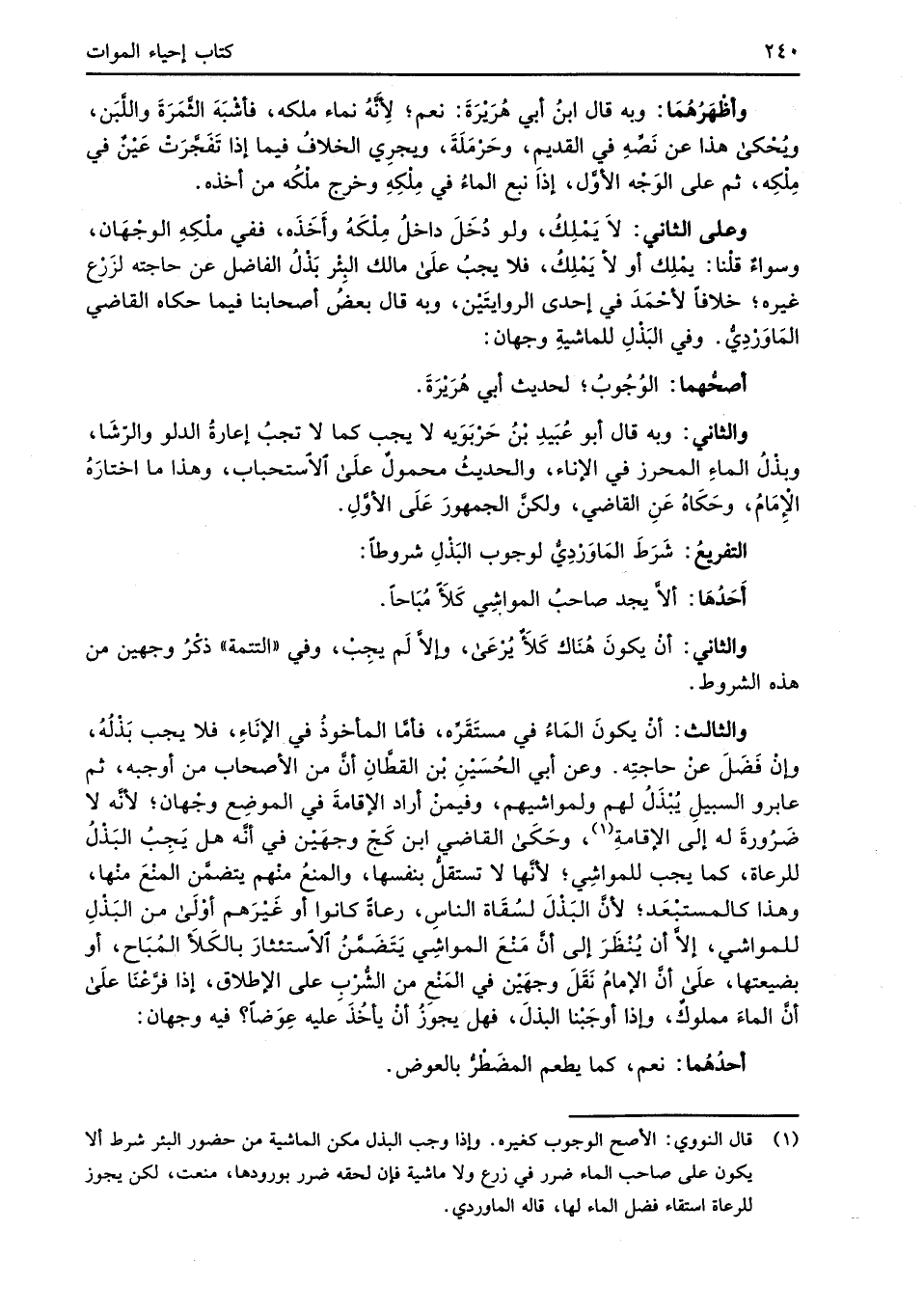 (¬1) قال النووي: الأصح الوجوب كغيره. وإذا وجب البذل مكن الماشية من حضور البئر شرط ألا يكون على صاحب الماء ضرر في زرع ولا ماشية فإن لحقه ضرر بورودها، منعت، لكن يجوز للرعاة استقاء فضل الماء لها، قاله الماوردي.