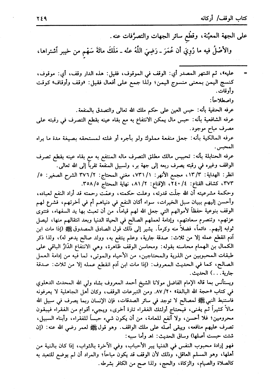 ويستأنس بما قاله الإمام الفاضل مولانا الشيخ أحمد المعروف بشاه ولي الله المحدث الدهلوي في كتاب "حجة الله البالغة" 20/ 87. ومن التبرعات الوقف، وكان أهل الجاهلية لا يعرفونه فاستنبط النبي -صلى الله عليه وسلم- لمصالح لا توجد في سائر الصدقات، فإن الإنسان ربما يصرف في سبيل الله مالاً كثيراً ثم يفنى، فيحتاج أولئك الفقراء تارة أخرى، ويجيء أقوام من الفقراء فيبقون محرومين؛ فلا أحسن، ولا أنفع للعامة، من أن يكون شيء حبساً للفقراء، وأبناء السبيل، تصرف أم منافعه، ويبقى أصله على ملك الواقف. وهو قول -صلى الله عليه وسلم- لعمر رضي الله عنه: (إن شئت حبست أصلها) وساق الحديث: اهـ وأما سببه: