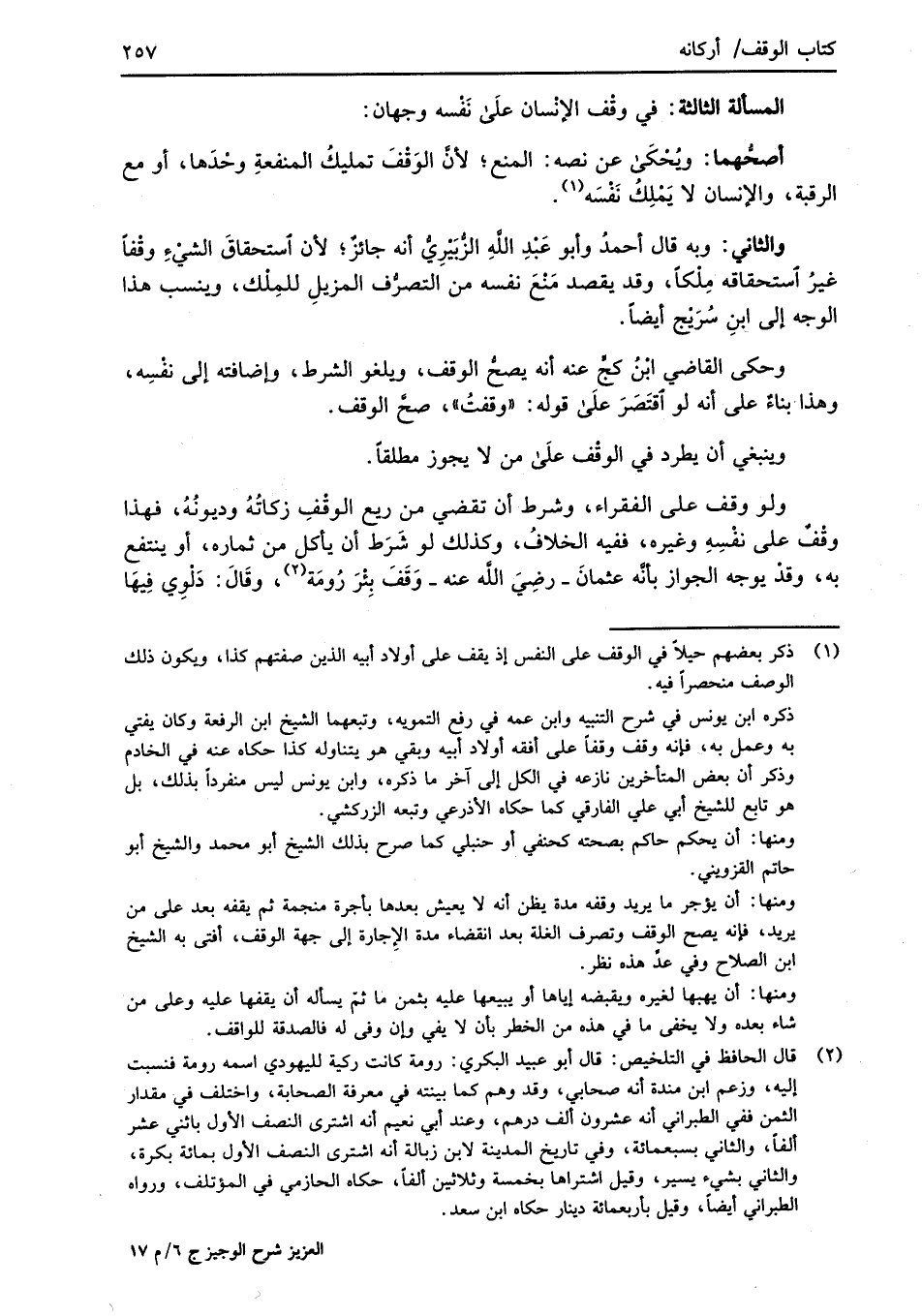 ولو وقف على الفقراء، وشرط أن تقضي من ريع الوقْفِ زكاتُهُ وديونُهُ، فهذا وقْفٌ على نفْسِهِ وغيره، ففيه الخلافُ، وكذلك لو شَرَط أنَّ يأكل من ثماره، أو ينتفع به، وقدْ يوجه الجواز بأنَّه عثمانَ -رضِيَ الله عنه- وَقَفَ بِئْرَ رُومَة (¬2)، وقَالَ: دَلْوِي فِيهَا