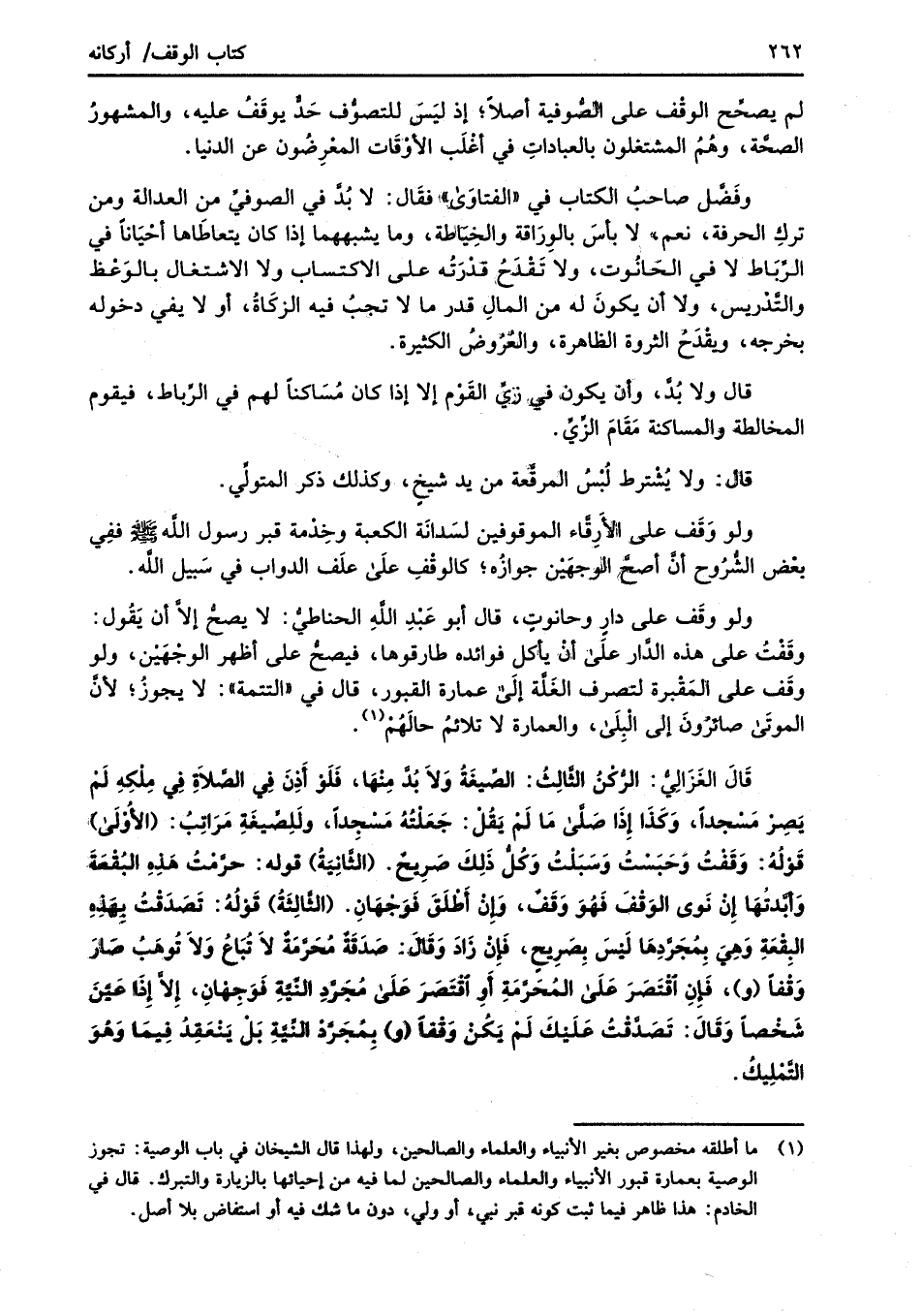 وفَضَّل صاحبُ الكتاب في "الفتاوَى" فقَال: لا بُدَّ في الصوفيِّ من العدالة ومن تركِ الحرفة، نعم, لا بأسَ بالوِرَاقة والخِيَاطة، وما يشبههما إذا كان يتعاطَاها أحْيَاناً في الرِّبَاط لا في الحَانُوت، ولا تَقْدَحُ قدْرَتُه على الاكتساب ولا الاشتغال بالوَعْظ والتَّدْريس، ولا أن يكونَ له من المالِ قدر ما لا تجبُ فيه الزكَاةُ، أو لا يفي دخوله بخرجه، ويقْدَحُ الثروة الظاهرة، والعُرُوضُ الكثيرة.