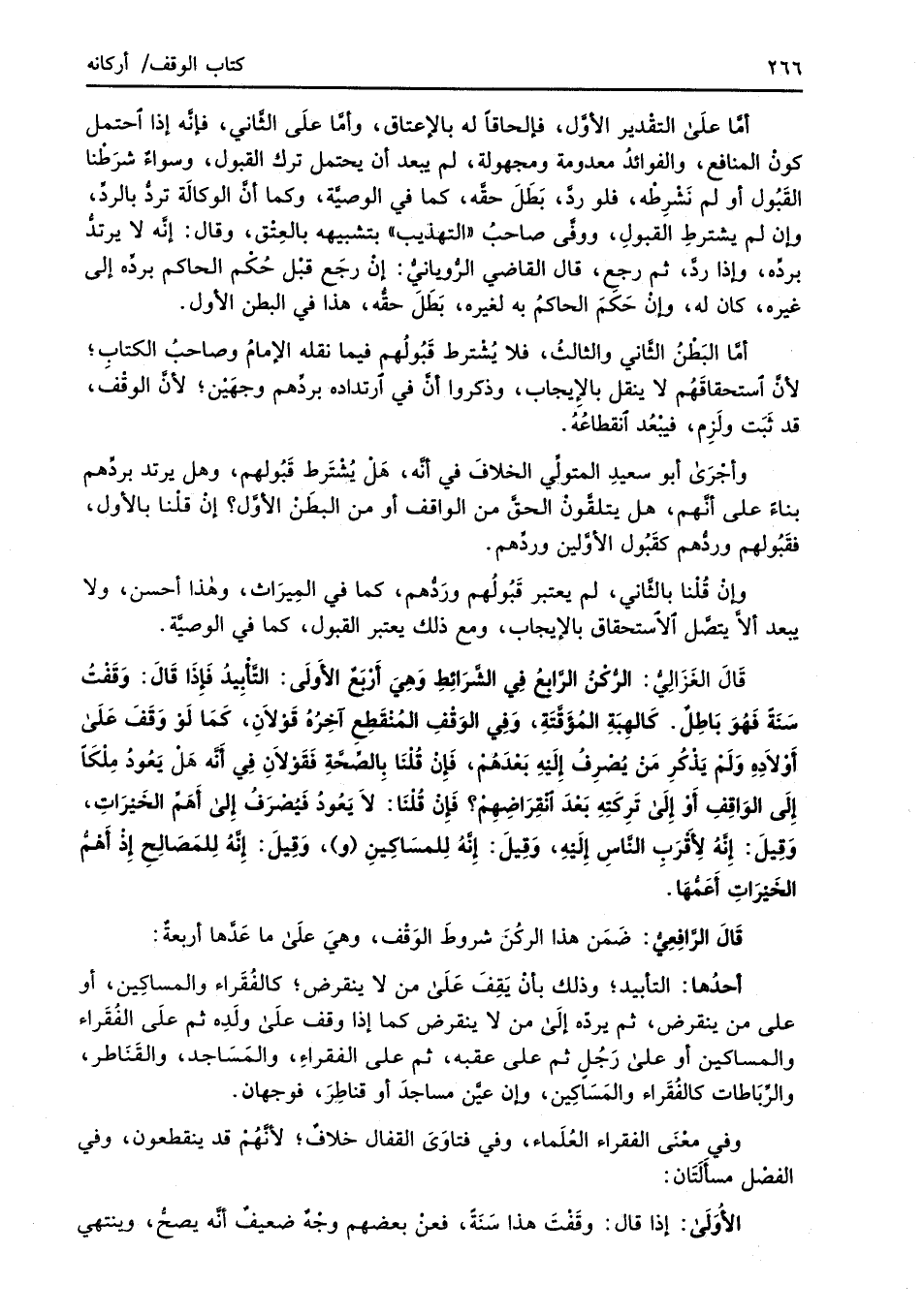 قَالَ الغَزَالِيُّ: الرُّكْنُ الرَّابعُ في الشَّرَائِطِ وَهِيَ أَرْبَعٌ الأَولَى: التَّأْبِيدُ فَإذَا قَالَ: وَقَفْتُ سَنَةً فَهُوَ بَاطِلٌ. كَالهِبَةِ المُؤَقَّتَةِ، وَفِي الوَقْفِ المُنْقَطِعِ آخِرُهُ قَوْلاَنِ، كَمَا لَو وَقَفَ عَلَى أَوْلاَدِهِ وَلَمْ يَذْكُرِ مَنْ يُصْرِفُ إِلَيْهِ بَعْدَهُمْ، فَإِنْ قُلْنَا بِالصِّحَّةِ فَقَوْلاَنِ في أَنَّه هَلْ يَعُودُ مِلْكَاً إِلَى الوَاقِفِ أَوْ إلَى تَرِكَتِهِ بَعْدَ انْقِرَاضِهِمْ؟ فَإِنْ قُلْنَا: لاَ يَعُودُ فَيُصْرَفُ إِلى أَهَمِّ الخَيْرَاتِ، وَقِيلَ: إِنَّهُ لأَقْرَبِ النَّاسِ إِلَيْهِ، وَقِيلَ: إِنَّهُ لِلمسَاكِينِ (و)، وَقِيلَ: إِنَّهُ لِلمَصَالِحِ إِذْ أَهْمُّ الخَيْرَاتِ أَعَمُّهَا.