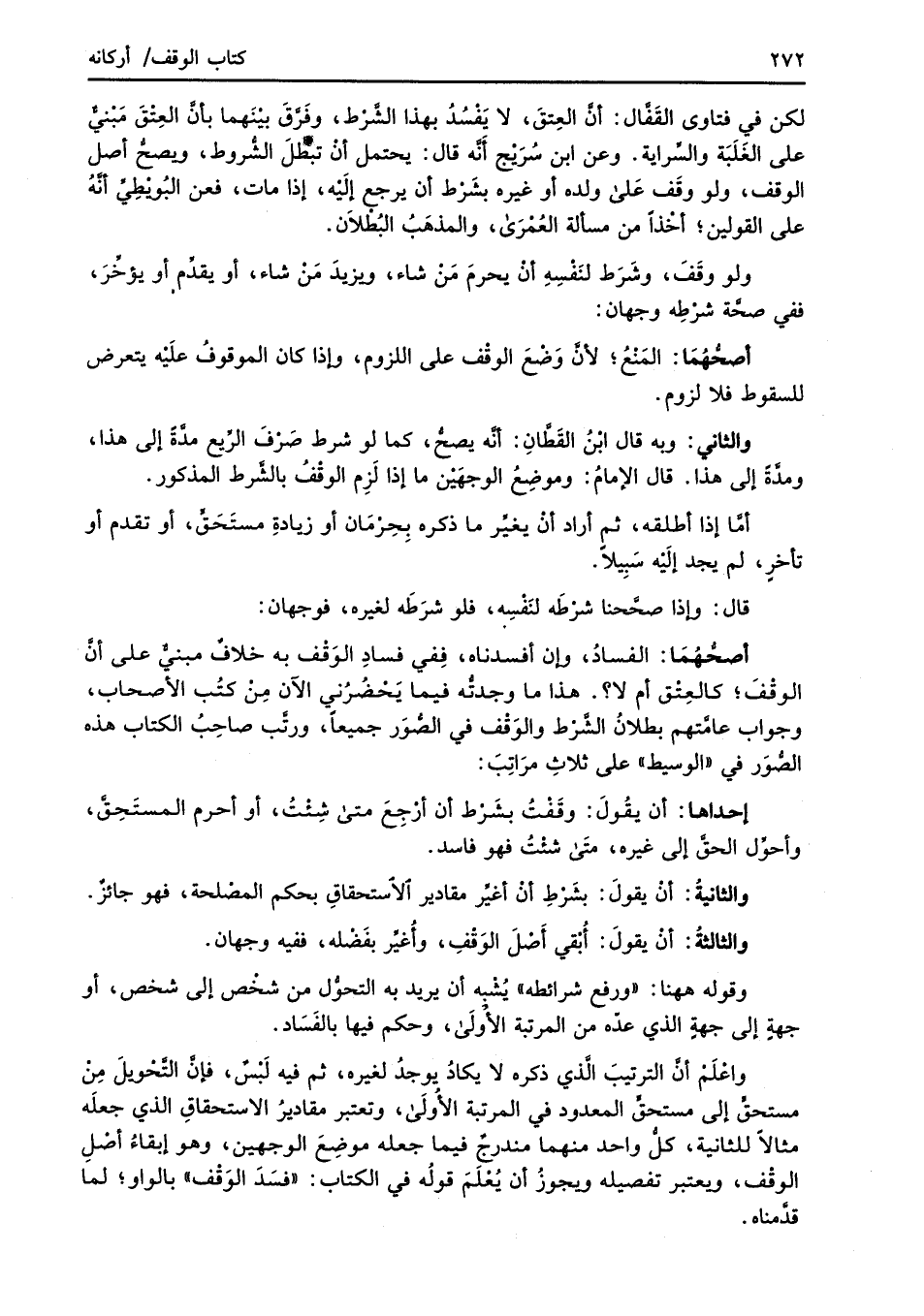 لكن في فتاوى القَفَّال: أنَّ العِتقَ، لا يَفْسُدُ بهذا الشَّرْط، وفَرَّقَ بيْنَهما بأنَّ العِتْقَ مَبْنيٌّ على الغَلَبَة والسِّراية. وعن ابن سُرَيْج أَنَّه قال: يحتمل أنْ تبطلَ الشُّروط، ويصحُّ أصل الوقْف، ولو وقَف عَلى ولده أو غيره بشَرْط أن يرجع إلَيْه، إذا مات، فعن البُويْطِيِّ أنَّهُ على القولين؛ أخْذاً من مسألة العُمْرَى، والمذهَبُ البُطْلاَن.