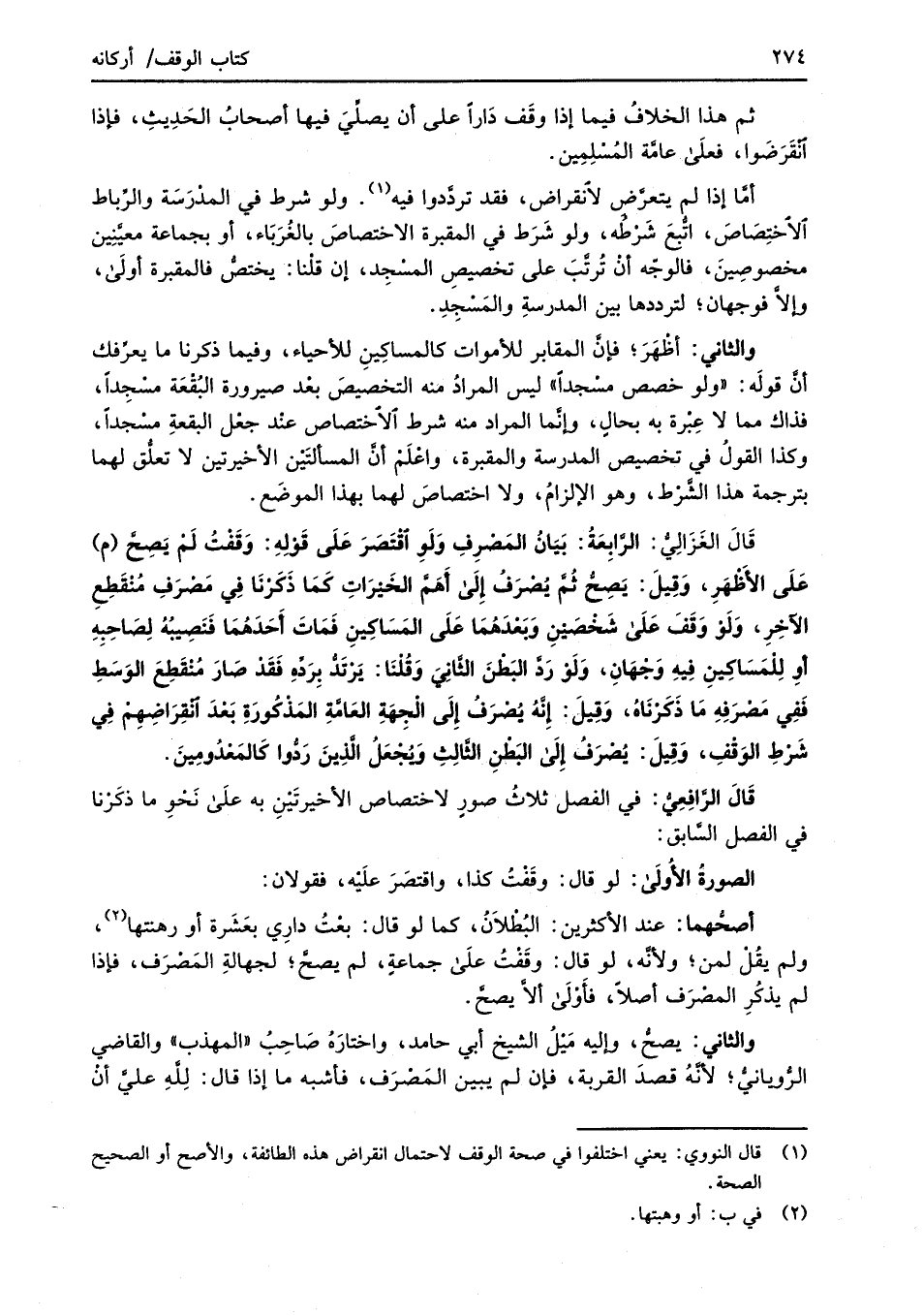 قَالَ الغَزَالِيُّ: الرَّابِعَةُ: بَيَانُ المَصْرِفِ وَلَوِ اقْتَصَرَ عَلَى قَوْلِهِ: وَقَفْتُ لَمْ يَصِحَّ (م) عَلَى الأَظْهَرِ، وَقِيلَ: يَصِحُّ ثُمَّ يُصْرَفُ إِلَى أَهَمَّ الخَيْرَاتِ كَمَا ذَكَرنَا في مَصْرَفِ مُنْقَطِعِ الآخِرِ، وَلَوْ وَقَفَ عَلَى شَخْصَيْنِ وَبَعْدَهُمَا عَلَى المَسَاكِينِ فَمَاتَ أَحَدَهُمَا فَنَصِيبُهُ لِصَاحِبِهِ أوِ لِلْمَسَاكِينِ فِيهِ وَجْهَانِ، وَلَو رَدَّ البَطْنَ الثَّانِيَ وَقُلْنَا: يَرْتَدُّ بِرَدِّهِ فَقَدْ صَارَ مُنْقَطِعَ الوَسَطِ فَفِي مَصْرَفِهِ مَا ذَكَرْنَاهُ، وَقِيلَ: إنَّهُ يُصْرَفُ إلَى الْجِهَةِ العَامَّةِ المَذْكُورَةِ بَعْدَ انقِرَاضِهِمْ فِي شَرْطِ الوَقْفِ، وَقِيلَ: يُصْرَفُ إِلَى البَطْنِ الثَّالِثِ وَيُجْعَلُ الَّذينَ رَدُّوا كَالمَعْدُومِينَ.