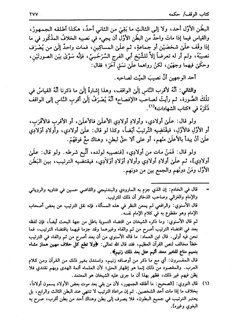 (¬1) قال النووي: [الصحيح: ما أطلقه الجمهور؛ لأن من بقي بعد موت بعض الأولاد يسمون أولاداً، بخلاف ما إذا مات أحد الشخصين. ثم إن مراعاة الترتيب لا تنتهي عند البطن الثالث والرابع، بل يعتبر الترتيب في جميع البطون، فلا يصرف إلى بطن وهناك أحد من بطن أقرب، صرح به البغوي وغيره].
