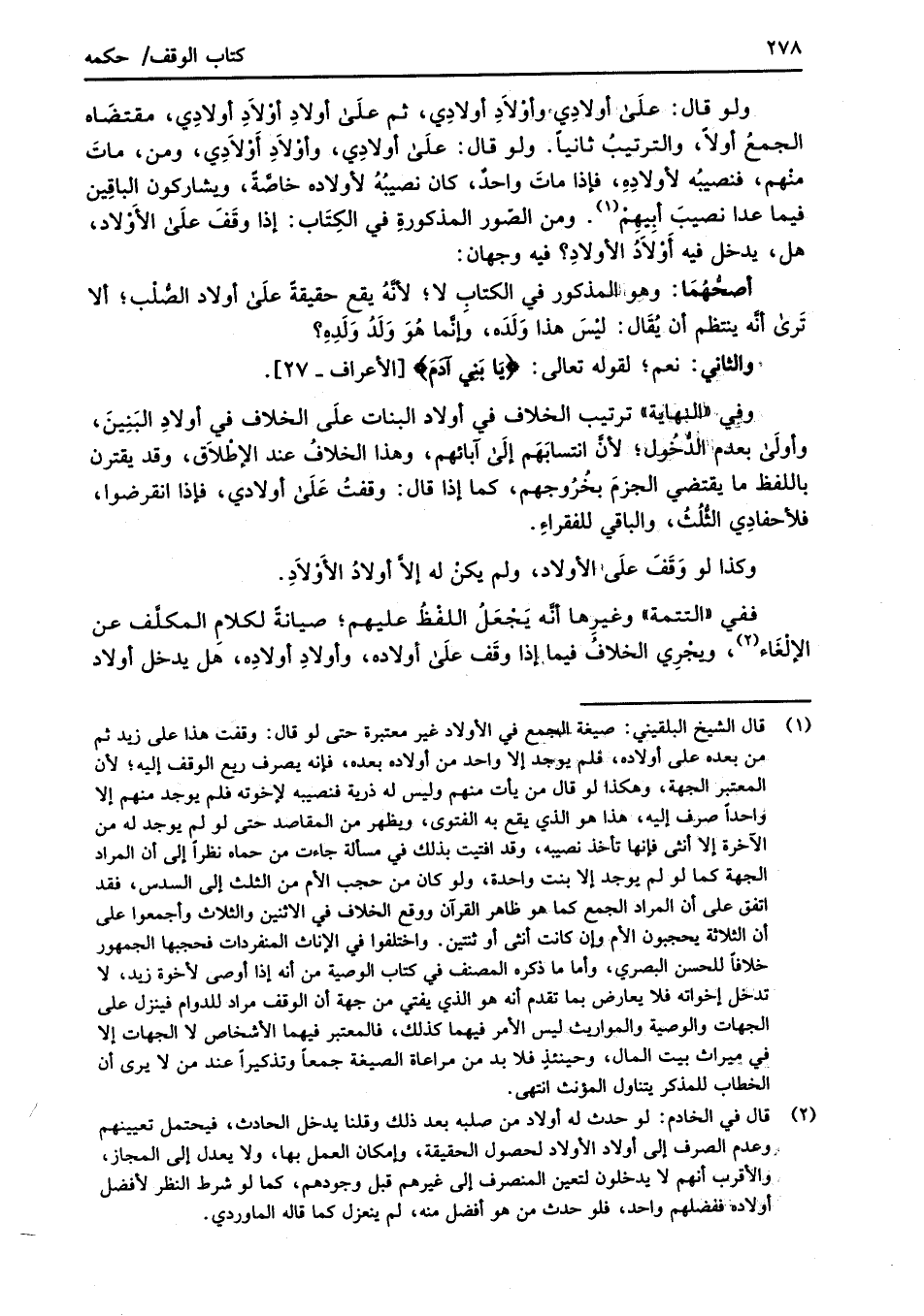 (¬1) قال الشيخ البلقيني: صيغة الجمع في الأولاد غير معتبرة حتى لو قال: وقفت هذا على زيد ثم من بعده على أولاده، فلم يوجد إلا واحد من أولاده بعده، فإنه يصرف ريع الوقف إليه؛ لأن المعتبر الجهة، وهكذا لو قال من يأت منهم وليس له ذرية فنصيبه لإخوته فلم يوجد منهم إلا واحداً صرف إليه، هذا هو الذي يقع به الفتوى، ويظهر من المقاصد حتى لو لم يوجد له من الآخرة إلا أنثى فإنها تأخذ نصيبه، وقد افتيت بذلك في مسألة جاءت من حماه نظراً إلى أن المراد الجهة كما لو لم يوجد إلا بنت واحدة، ولو كان من حجب الأم من الثلث إلى السدس، فقد اتفق على أن المراد الجمع أمَّا هو ظاهر القرآن ووقع الخلاف في الاثنين والثلاث وأجمعوا على أن الثلاثة يحجبون الأم وإن كانت أنثى أو ثنتين. واختلفوا في الإناث المنفردات فحجبها الجمهور خلافاً للحسن البصري، وأما ما ذكره المصنف في كتاب الوصية من أنه إذا أوصى لأخوة زيد، لا تدخل إخواته فلا يعارض بما تقدم أنه هو الذي يفتي من جهة أن الوقف مراد للدوام فينزل على الجهات والوصية والمواريث ليس الأمر فيهما كذلك، فالمعتبر فيهما الأشخاص لا الجهات إلا في ميراث بيت المال، وحينئذٍ فلا بد من مراعاة الصيغة جمعاً وتذكيراً عند من لا يرى أن الخطاب للمذكر يتناول المؤنث انتهى.