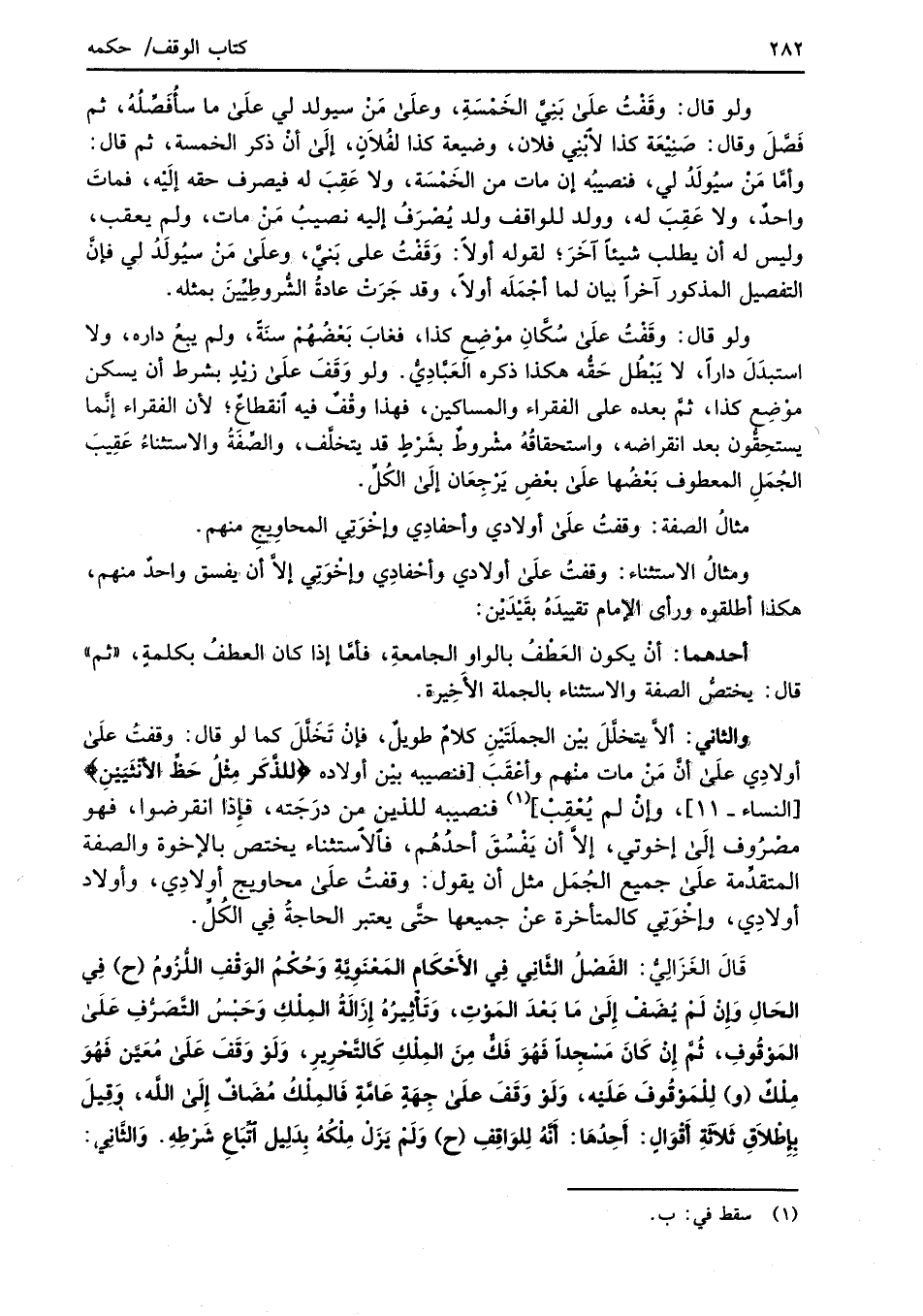 قَالَ الغَزَالِيُّ: الفَصْلُ الثَّانِي في الأَحْكَام المَعْنَوِيَّةِ وَحُكْمُ الوَقْفِ اللُّزُومُ (ح) فِي الحَالِ وإنْ لَمْ يُضَفْ إِلَى مَا بَعْدَ المَوْتِ، وَتَأْثِيرُهُ إِزَالَةُ المِلْكِ وَحَبْسُ التَّصَرُّفِ عَلَى المَوْقُوفَ، ثُمَّ إنْ كَانَ مَسْجِداً فَهُوَ فَكٌّ مِنَ المِلْكِ كَالتَّحْرِيرِ، وَلَوْ وَقَفَ عَلَى مُعَيَّن فَهُوَ مِلْكٌ (و) لِلْمَوْقُوفَ عَلَيْه، وَلَوْ وَقَفَ عَلَى جِهَةٍ عَامَّةِ فَالمِلْكُ مُضَافٌ إِلَى الله، وَقِيلَ بِإِطْلاَقِ ثَلاَثةِ أَقْوَالٍ: أَحَدُهَا: أنَّهُ لِلوَاقِفِ (ح) وَلَمْ يَزَلْ مِلْكُهُ بِدَلِيل اتِّبَاعِ شَرْطِهِ. وَالثَّانِي:
