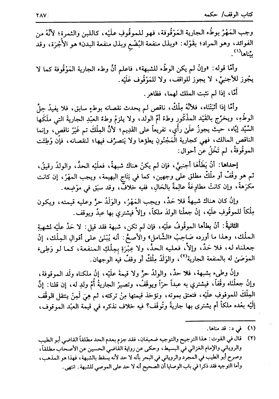 وإنْ وطئ بشبهة، فلا حدَّ، والولدُ حرٌّ ولا قيمةَ علَيْه، إنْ ملكناه ولَد الموقوفه، وإن جعلْنَاه وقْفاً، فيشتري به عبداً حرّاً ويوقَفُ، وتصيرُ الجاريةُ أُمَّ ولدِ له، إن قلنا: إنَّ المِلْكَ للموقوفِ علَيْه، فتعتق بموته، وتؤخذ قيقها مِنْ تركته، ثم هِيَ لَمِنْ ينتقل الوقْف إلَيْه بعْده ملكاً أم يشترى، بها جاريةً وتُوقَف؟ فيه خلاف نذكره في قيمة العبْد الموقوف،