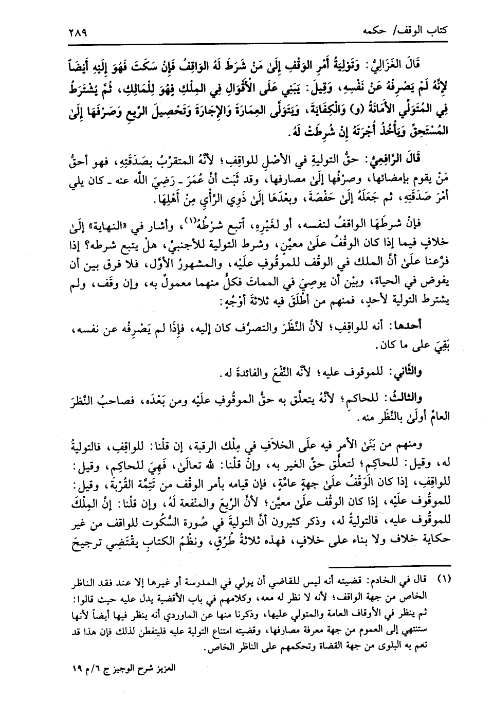 قَالَ الغَزَالِيُّ: وَتَوْلِيَةُ أَمْرِ الوَقْفِ إِلَى مَنْ شَرَطَ لَهُ الوَاقِفُ فَإِنْ سَكَتَ فَهُوَ إِلَيْهِ أَيْضَاً لإِنَّهُ لَمْ يَصْرِفْهُ عَنْ نَفْسِهِ، وَقِيلَ: يَبَنِي عَلَى الأَقْوَالِ في المِلْكِ فِهُوَ لِلْمَالِكِ، ثُمَّ يُشْتَرَطُ في المُتَوَلِّي الأَمَانَةُ (و) وَالْكفَايَةَ، وَبَتَوَلَّى العِمَارَةَ وَالإِجَارَةَ وَتَحْصِيلَ الرِّيعِ وَصَرْفَهَا إِلَى المُسْتَحِقِّ وَيأْخُذُ أجْرَتَهُ إنْ شُرِطَتْ لَهُ.
