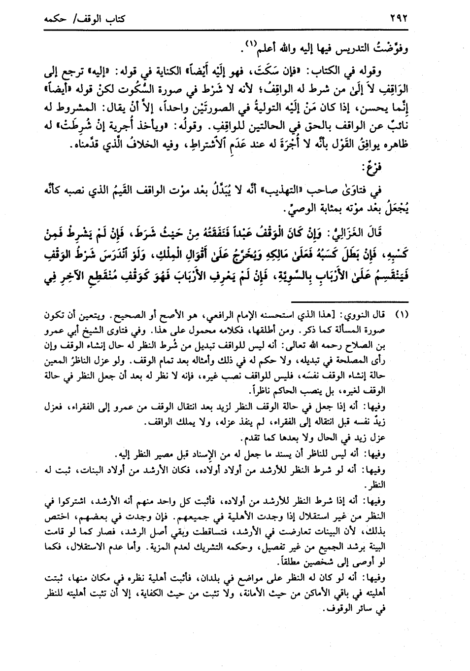 (¬1) قال النووي: [هذا الذي استحسنه الإمام الرافعي، هو الأصح أو الصحيح. ويتعين أن تكون صورة المسألة كما ذكر. ومن أطلقها، فكلامه محمول على هذا. وفي فتاوى الشيخ أبي عمرو بن الصلاح رحمه الله تعالى: أنه ليس للواقف تبديل من شُرط النظر له حال إنشاء الوقف وإن رأى المصلحة في تبديله، ولا حكم له في ذلك وأمثاله بعد تمام الوقف. ولو عزل الناظرُ المعين حالة إنشاء الوقف نفسه، فليس للواقف نصب غيره، فإنه لا نظر له بعد أن جعل النظر في حالة الوقف لغيره، بل يصب الحاكم ناظراً.