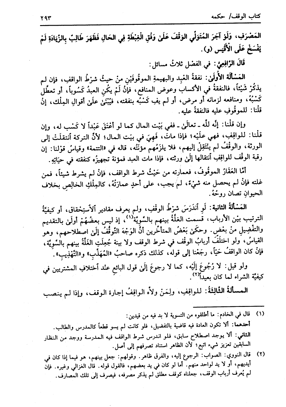 المَسْألَة الأوُلَى: نفقةُ العْبِد والبهيمةِ الموقُوفَيْنِ منْ حيثُ شرْطُ الواقفِ، فإن لم يذكُرْ شَيْئاً، فالنفقةُ في الأكساب وعوض المنافع، فإن لَمْ يكُنِ العبدُ كَسُوباً، أو تعطَّل كَسْبُهُ، ومنافعه لزمانه أو مرض، أو لم يفِ كَسْبُه بنفقته، فيُبْنَى عَلَى أقوالِ المِلْك، إنْ قلْنا: للموقُوفِ عليه فالنفقةُ عليه.