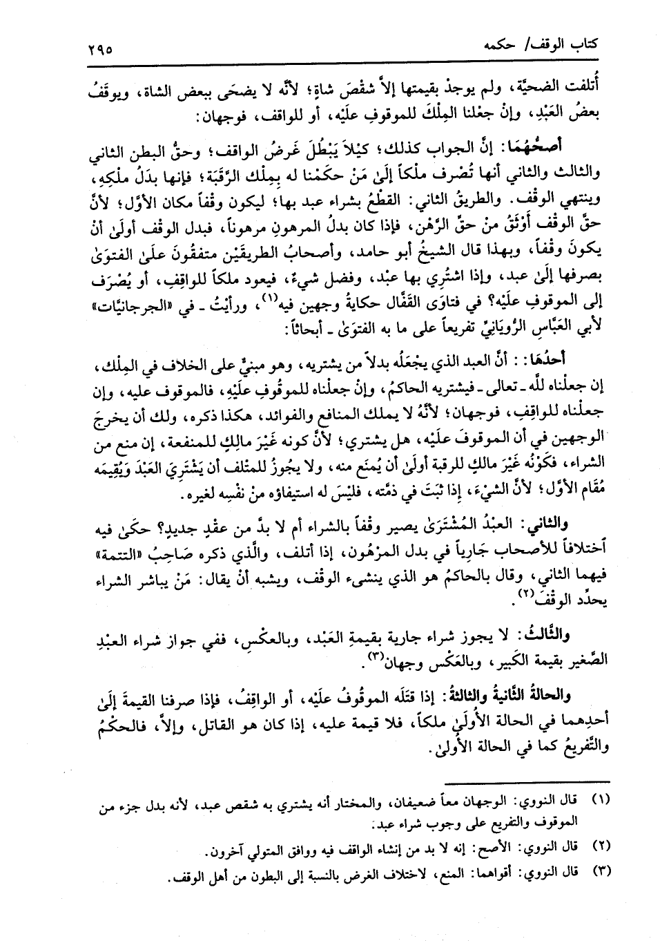 (¬1) قال النووي: الوجهان معاً ضعيفان، والمختار أنه يشتري به شقص عبد؛ لأنه بدل جزء من الموقوف والتفريع على وجوب شراء عبد.