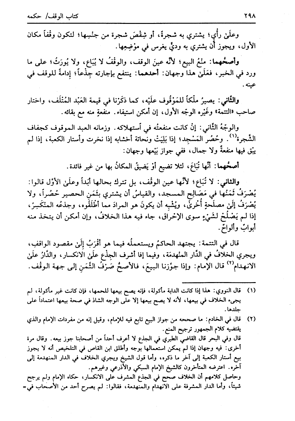 والوجهُ الثَّاني: إنْ كانت منفعتُه في استهلاكه. وزمانه العبد الموقوف كجفاف الشَّجرة (¬1). وحُصُر المَسجِد؛ إذا بَلِيَت ونحاتة أخشابه إذا نخرت وأستار الكعبة، إذا لم يبْق فيها منفعةٌ ولا جمال، ففي جواز بَيْعها وجهان: