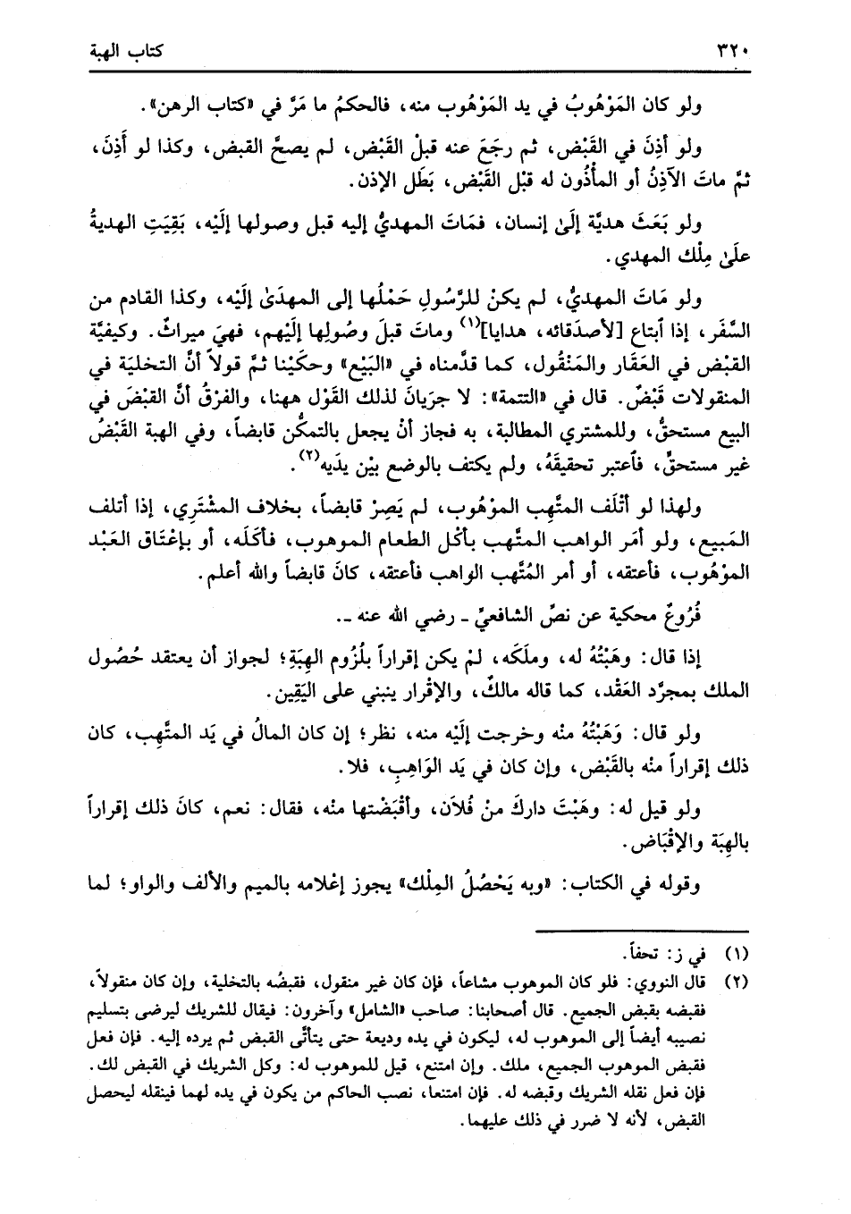 (¬2) قال النووي: فلو كان الموهوب مشاعاً، فإن كان غير منقول، فقبضُه بالتخلية، وإن كان منقولاً، فقبضه بقبض الجميع. قال أصحابنا: صاحب "الشامل" وآخرون: فيقال للشريك ليرضى بتسليم نصيبه أيضاً إلى الموهوب له، ليكون في يده وديعة حتى يتأتَّى القبض ثم يرده إليه. فإن فعل فقبض الموهوب الجميع، ملك. وإن امتنع، قيل للموهوب له: وكل الشريك في القبض لك. فإن فعل نقله الشريك وقبضه له. فإن امتنعا، نصب الحاكم من يكون في يده لهما فينقله ليحصل القبض؛ لأنه لا ضرر في ذلك عليهما.