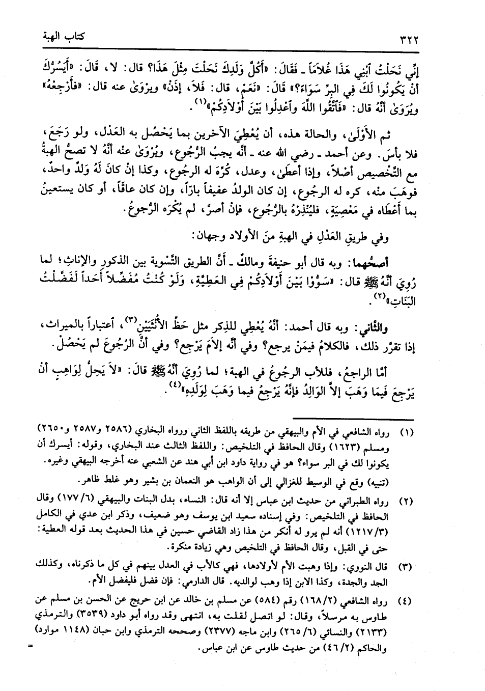(¬1) رواه الشَّافعي في الأم والبيهقي من طريقه باللفظ الثاني ورواه البخاري (2586 و 2587 و 2650) ومسلم (1623) وقال الحافظ في التلخيص: واللفظ الثالث عند البخاري، وقوله: أيسرك أن يكونوا لك في البر سواء؟ هو في رواية داود ابن أبي هند عن الشعبي عنه أخرجه البيهقي وغيره. (تنبيه) وقع في الوسيط للغزالي إلى أن الواهب هو النعمان بن بشير وهو غلط ظاهر.