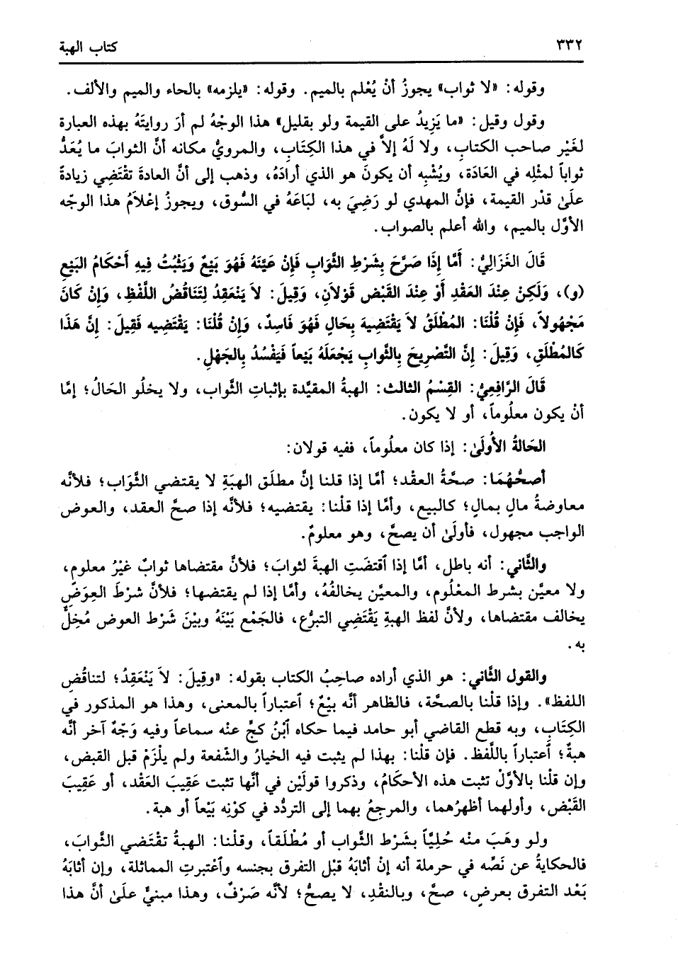 وقول وقيل: "ما يَزِيدُ على القيمة ولو بقليل" هذا الوجْهُ لم أرَ روايتَهُ بهذه العبارة لغَيْر صاحب الكتاب، ولا لَهُ إلاَّ في هذا الكِتَاب، والمرويُّ مكانه أنَّ الثوابَ ما يُعَدُّ ثواباً لمثْلِه في العَادَة، ويُشْبِه أن يكونَ هو الذي أرادَهُ، وذهب إلى أنَّ العادةَ تقْتَضِي زيادةً عَلَى قدْر القيمة، فإنَّ المهَدي لو رَضِيَ به، لبَاعَهُ في السُّوق، ويجوزُ إعْلاَمُ هذا الوجّه الأوَّل بالميم، والله أعلم بالصواب.