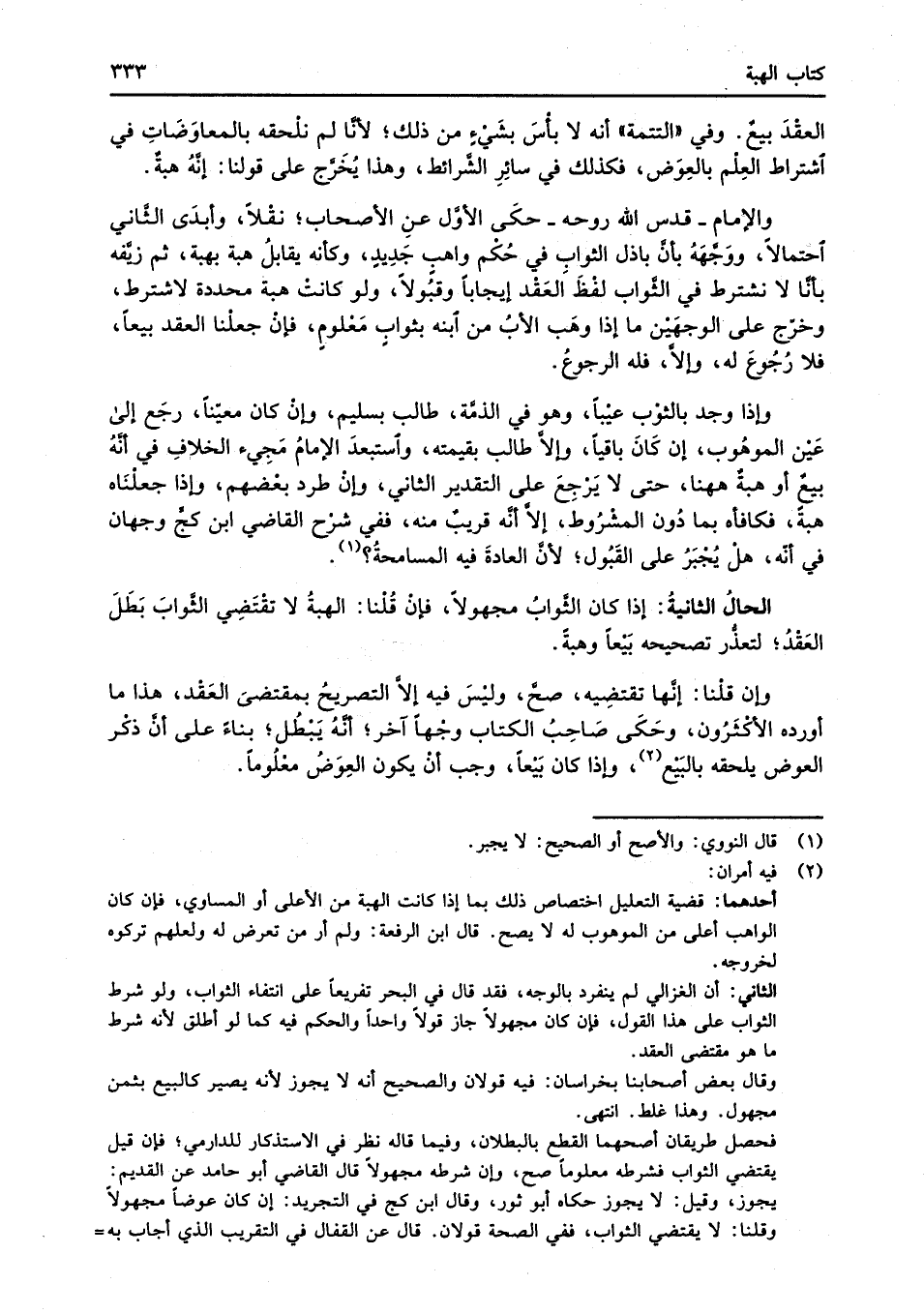 والإمام -قدس الله روحه- حكَى الأوَّل عنِ الأصحاب؛ نقْلاً، وأبدَى الثَّاني احتمالاً، ووَجَّهَهُ بأنَّ باذل الثواب في حُكْم واهبٍ جَدِيدٍ، وكأنه يقابلُ هبة بهبة، ثم زيَّفه بأنَّا لا نشترط في الثَّواب لفْظَ اَلعَقْد إيجاباً وقبُولاً، ولو كانتْ هبة محددة لاشترط، وخرّج على الوجهَيْن ما إذا وهَب الأبُ منْ ابنه بثوابٍ مَعْلومٍ، فإنْ جعلْنا العقد بيعاً، فلا رُجُوعَ له، وإلاَّ، فله الرجوعُ.