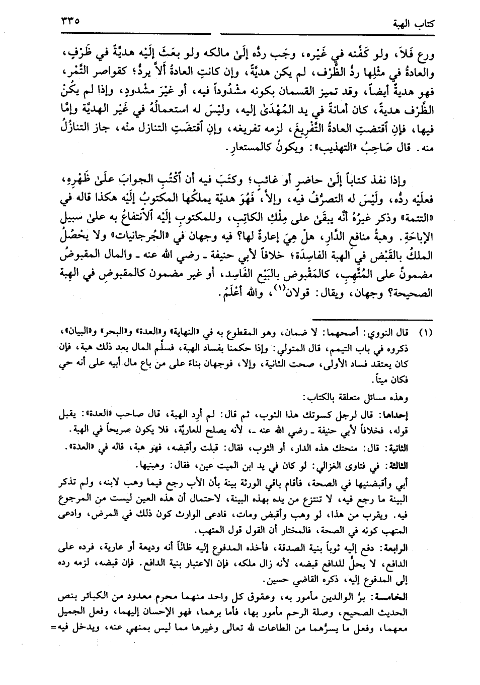 وإذا نفذ كتاباً إلَى حاضرٍ أو غائبٍ؛ وكتَبَ فيه أن اكْتُبِ الجوابَ عَلَى ظَهرِهِ، فعلَيْه ردُّه، ولَيْسَ له التصرُّفُ فيه، إلاَّ، فَهُوَ هديّة يملكُها المكَتوبُ إلَيْه هكذا قاله في "التتمة" وذكر غيرُهُ أنَّه يبقَى على مِلْكِ الكاتِب، وللمكتوبِ إلَيْه الانتفاعُ به على سبيل الإباحَةِ. وهبةُ منافعِ الدَّارِ، هلْ هِيَ إعارةٌ لها؟ فيه وجهان في "الجُرجانيات" ولا يحْصُلُ الملكُ بالقَبْض في الهبة الفاسِدَة؛ خلافاً لأبي حنيفة -رضي الله عنه- والمال المقبوضُ مضمونٌ على المُتَّهِبِ، كالمَقْبوض بالبَيْع الفَاسِد، أو غير مضمون كالمقبوضِ في الهِبة الصحيحة؟ وجهان، ويقال: قولان (¬1)، والله أعْلَمُ.